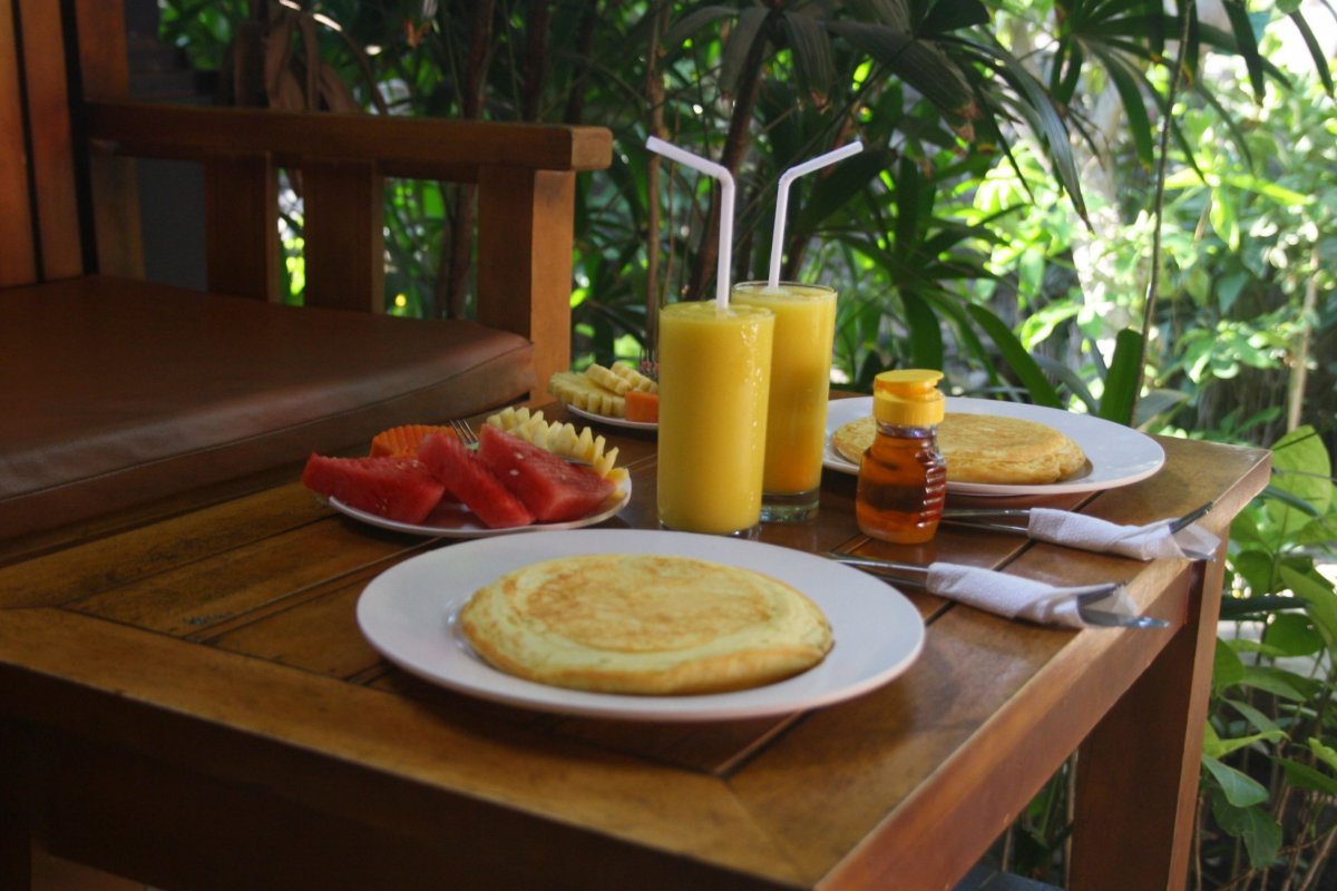 Prvního rána v Pemuteranu nás z hlubokého spánku vytrhává klepání na dveře - to nám servírují snídani, kterou jsme si optimisticky objednali už na 9:30. Snídaně tu jsou určitě nejlepší za celou dovolenou: pořádná banánovo-ananasová palačinka s medem (ale v nabídce je i rýže či nudle), velká porce ovoce a navrch čerstvý ledový džus.