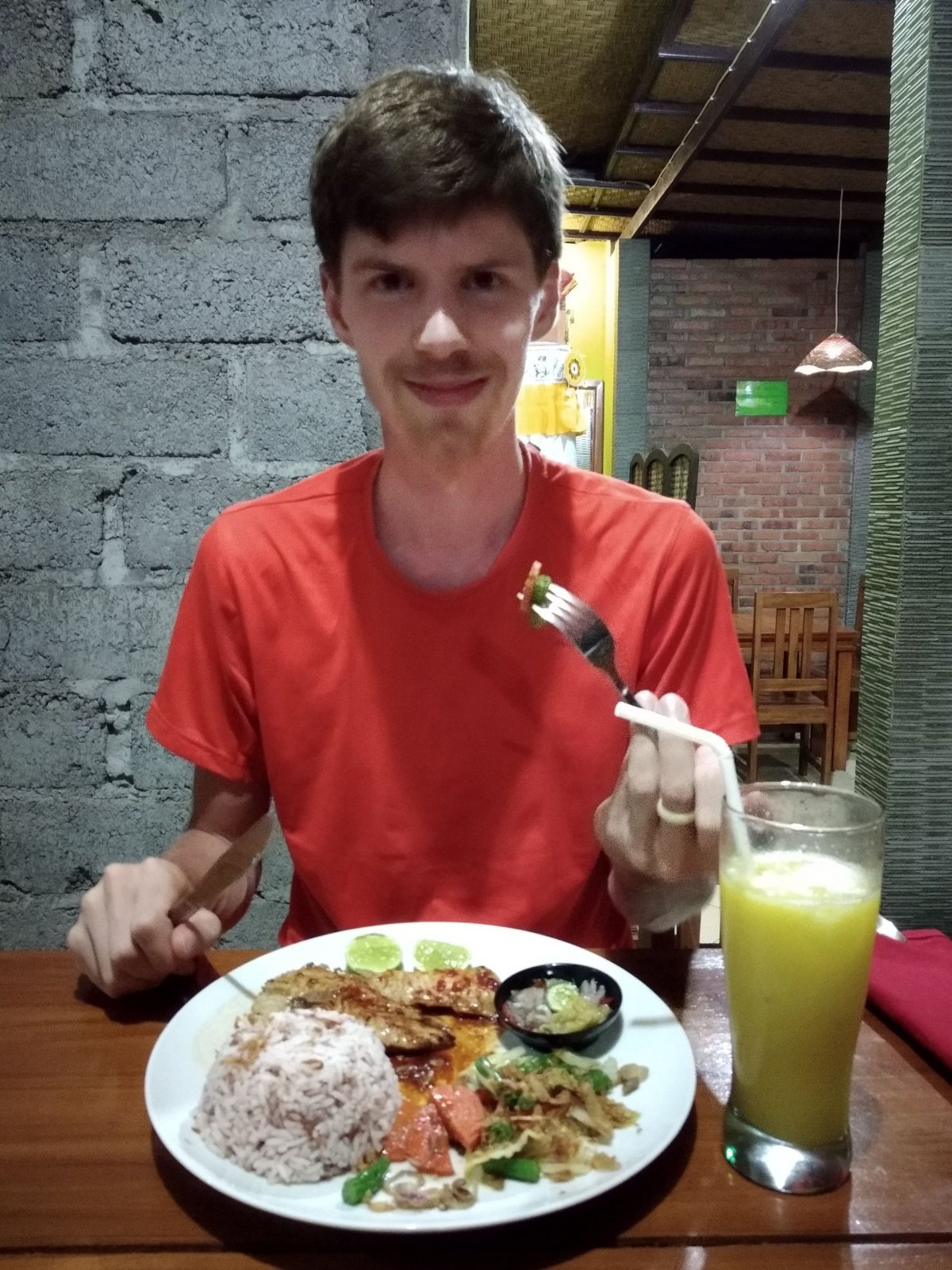 Na večeři vyrážíme do další vyhlášené restaurace, která je úplně narvaná, ale někam se nám daří se vmáčknout. Dáváme si spousty džusů a zdravotní kolu, výborný rybí filet a jako dezert jakési bramborové šišky s kokosem, které jsme navzdory značnému sebezapření nedojedli. Ne že bychom už nemohli, ale bylo to fakt nedobré. Mangový džus nám ale jako vždy spravuje chuť i náladu a domů odcházíme spokojení. Paní domu akorát roznáší po zahradě vonné tyčinky a malé obětinky. Tyto mističky z banánových listů tady najdete na každém kroku a musíte dávat pozor, abyste nějakou nerozšlápli a nezpůsobili náboženské faux-pas.