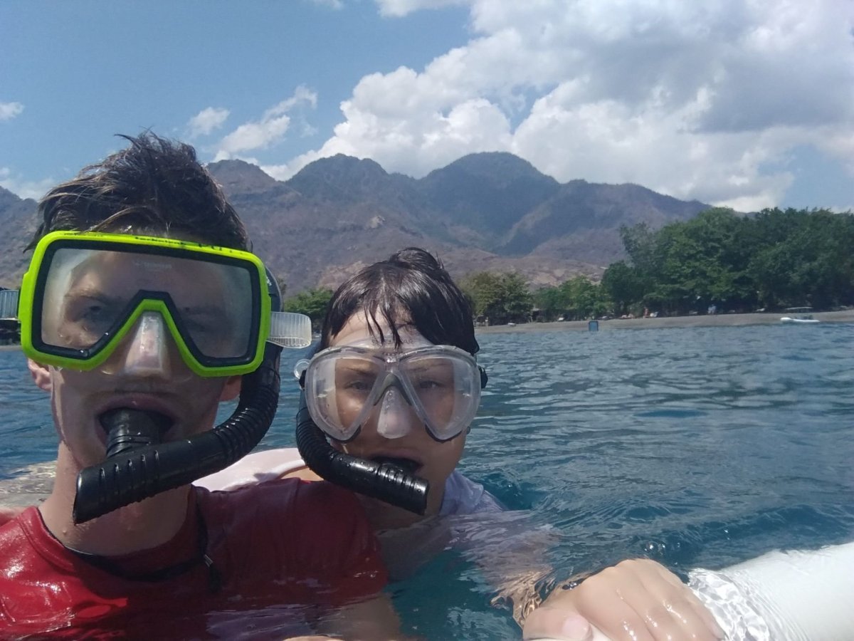Po pár hodinách spánku a dvou sopkách za poslední dva dny máme v plánu odpočívat ze všech sil. Takže přirozeně hned po snídani si půjčujeme šnorchlovací vybavení (zdarma v ubytování) a míříme na pláž. Černý písek je neskutečně žhavý, až se to pomalu nedá ani přeběhnout. Šnorchlování je v Pemuteranu populární mimo jiné díky unikátnímu projektu obnovy korálových útesů. Nedaleko od břehu se tu pěstují různé druhy korálů. Růst korálů tu dokonce podporují slabým elektrickým proudem, o čemž svědčí přes pláž natažené kabely. Je to vážně zajímavé, obzvlášť se nám líbí “mořské školky”, kde jsou na kovovém roštu vedle sebe “vysázené” desítky malinkých korálů. Skvělá zpráva je, že se sem vrací podvodní život - kolem korálů a sasanek pozorujeme hvězdice a rybičky, z nichž poznáváme například Pixarem proslavené klauny. Zbytek dne už jen poléháváme a Kája si konečně začíná užívat dovolenou :-) Je pravda, že ten uplynulý týden byl plný náročných výletů a přesunů a musíme to všechno vstřebat. Na pláži rozhodně nejsou žádné davy a panuje tu příjemný klid.