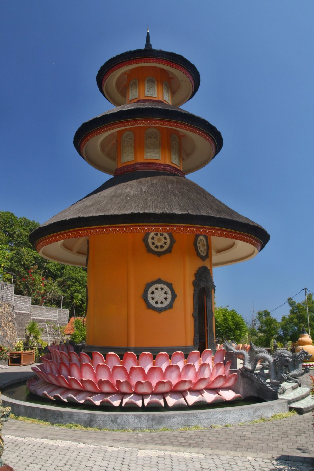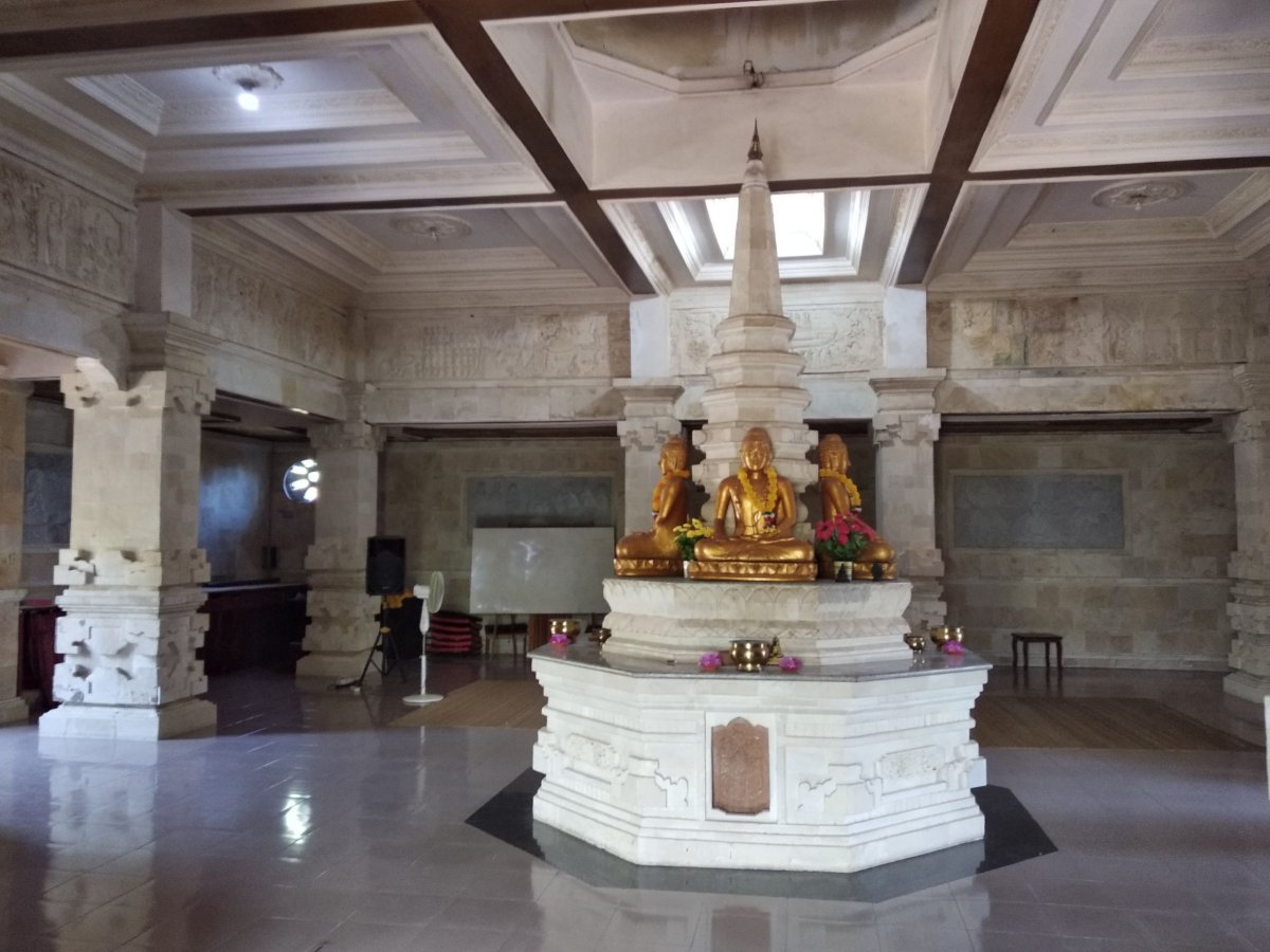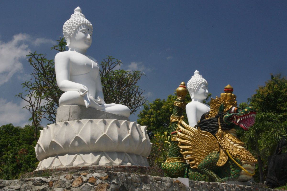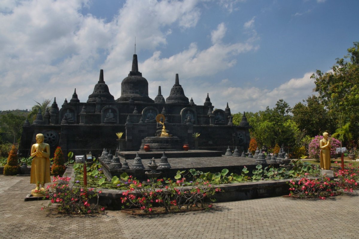 Od moře se záhy vzdalujeme a stoupáme do kopců, kde zastavujeme před buddhistickým klášterem Brahma Vihara Arama. Po zaplacení dobrovolného vstupného procházíme rozsáhlý areál plný chrámů, soch a rybníčků s lekníny. Oproti chrámům co jsme viděli v Thajsku je tady jasně znatelný vliv hinduistické architektury. Dobře patrné je to třeba z charakteristické kamenné brány. Kromě staveb se kocháme i výhledy na okolní kopce a mořský horizont.