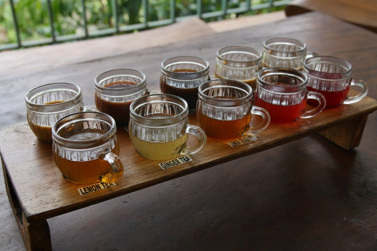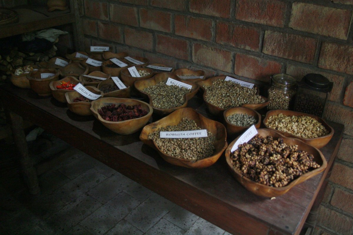 Další zastávkou dnešního výletu je kávová a čajová plantáž. Ještě předtím se posilujeme ve warungu, abychom pak to kafe nepili nalačno. Se slečnou průvodkyní procházíme plantáží a dozvídáme se o různých druzích kávy, mimo jiné samozřejmě i o proslulé cibetkové kávě (luwak coffee). Jednu cibetku v kleci nám i slečna ukazuje. Následuje návštěva malé pražírny, kde si prohlížíme a očicháváme rozličné druhy kávových zrn a také koření. A na závěr se dočkáme i ochutnávky místních produktů - v roztomilých malých skleničkách je nám naservírováno deset vzorečků kávy a čaje. Z čajů nám nejvíc zachutnal lemon grass, z kávy bych diplomaticky vybral právě tu balijskou. Poslední zastávka je v obchodu se suvenýry, kde nakupujeme jako suvenýry ochucené i neochucené čaje a kávy. Prohlídka a degustace byly jinak zcela zdarma.