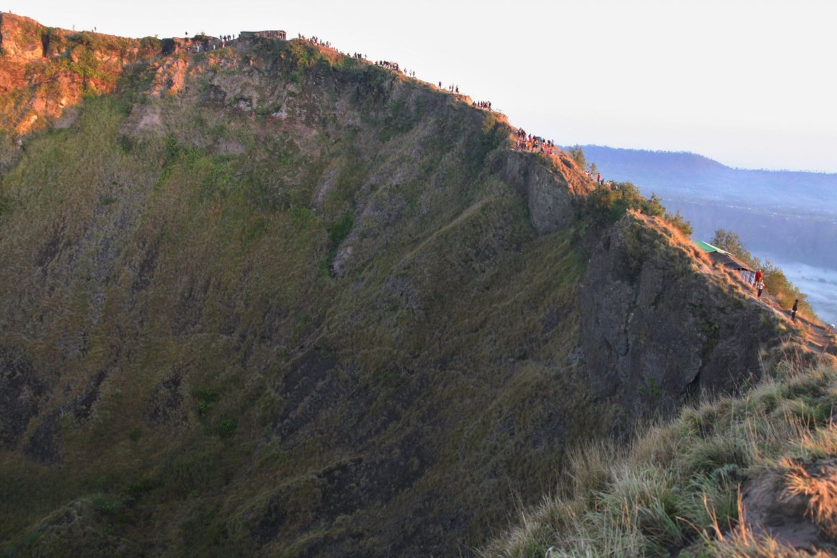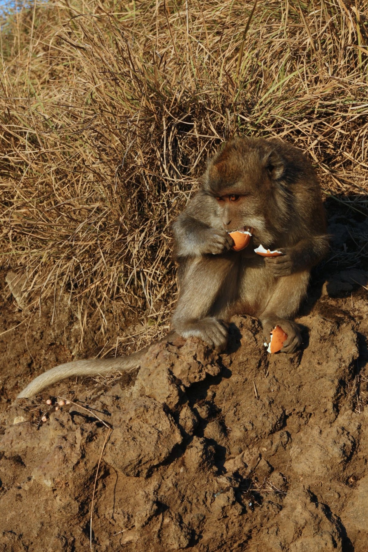 Cesta je čím dál strmější a krátký úsek vede i sopečným prachem, kde se jde ve stylu “uděláš krok, zaboříš se po kotník a sjedeš o půl kroku zpátky”. Konečně stojíme na okraji kráteru sopky Batur ve výšce 1717 metrů. Do východu slunce zbývá pár desítek minut a náš průvodce nám servíruje svačinku: sendvič s banánem a s vajíčkem na tvrdo. A poté už na horizontu startuje světelná show. Sluníčko nám odkrývá siluety dvou kopců a obrovského jezera Batur u jejich úpatí. Za vyšším z kopců se v dálce rýsuje obrys činné sopky Agung, nejvyššího bodu na Bali. Zanedlouho dosáhnou teplé sluneční paprsky i na nás a kráter je osvětlený oním magickým oranžovým světlem, které svítí jen pár chvil denně. Ještě chvíli rozjímáme a pomalu míříme dolů. Cestou potkáváme opičky, které se až sem na kopec vyšplhaly pro naše zbytky. Náš horský vůdce nám ještě ukazuje místa, kudy z hory uniká teplý vzduch a pára. Prý se v tom dá i ohřát jídlo, ale nemáme už nic, na čem bychom to otestovali.