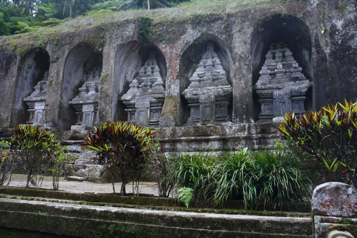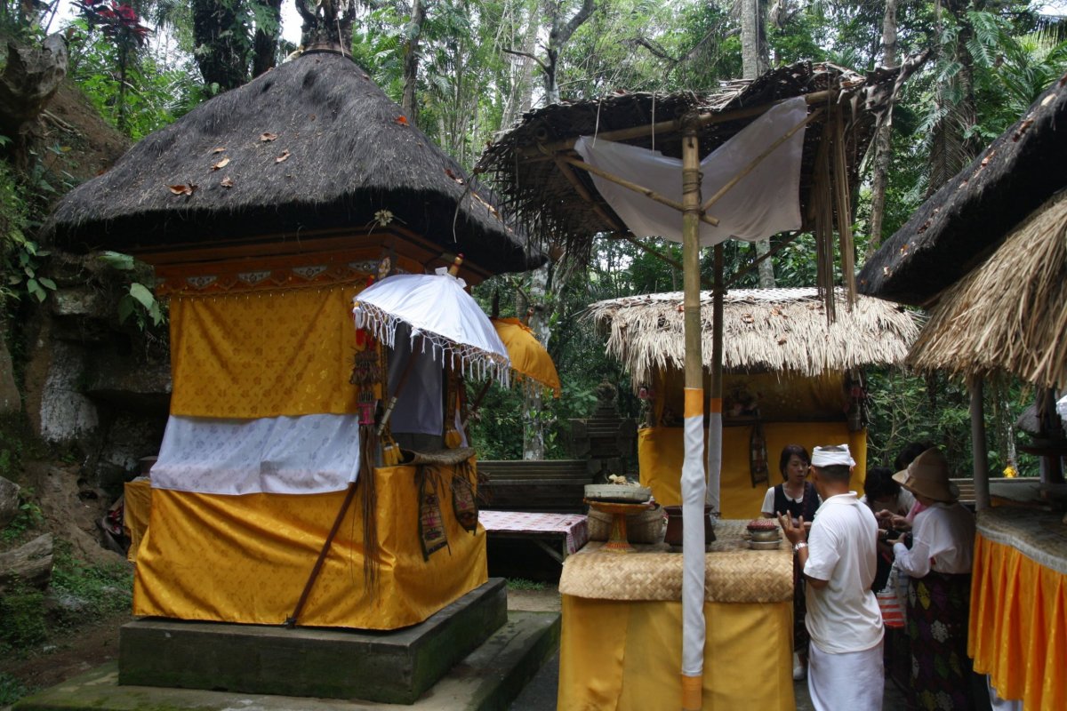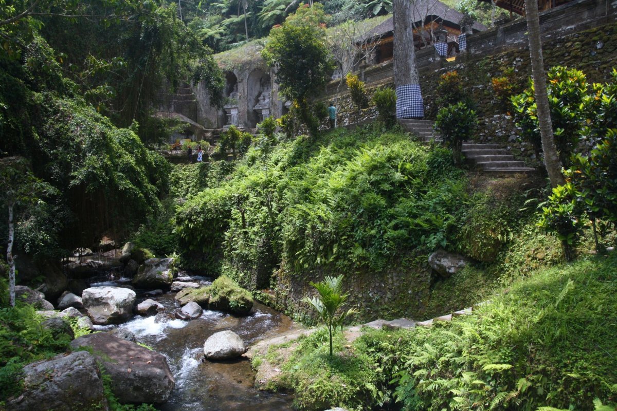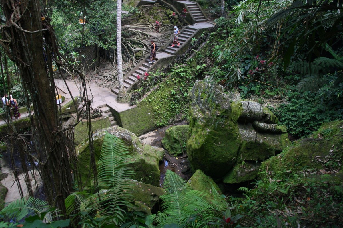 Goa Gajah je podlé mého názoru typickým příkladem toho, že nelze věřit všem superlativům v recenzích. V malém zeleném údolíčku je rozprostřeno pár nefotogenických malých svatyní a rybníček s lekníny. Hlavní “atrakce” v podobě jeskyňky se vstupem v podobě úst boha (nebo démona?) nás vysloveně zklamala - uvnitř malého prostoru není zhola nic. Příjemné zátiší tu naopak vytváří zurčící říčka s mechem porostlými skalami a také stromy s mohutnými povrchovými kořeny. Ale i tak největším zážitkem spojeným s návštěvou zůstane naše originální cesta dovnitř.