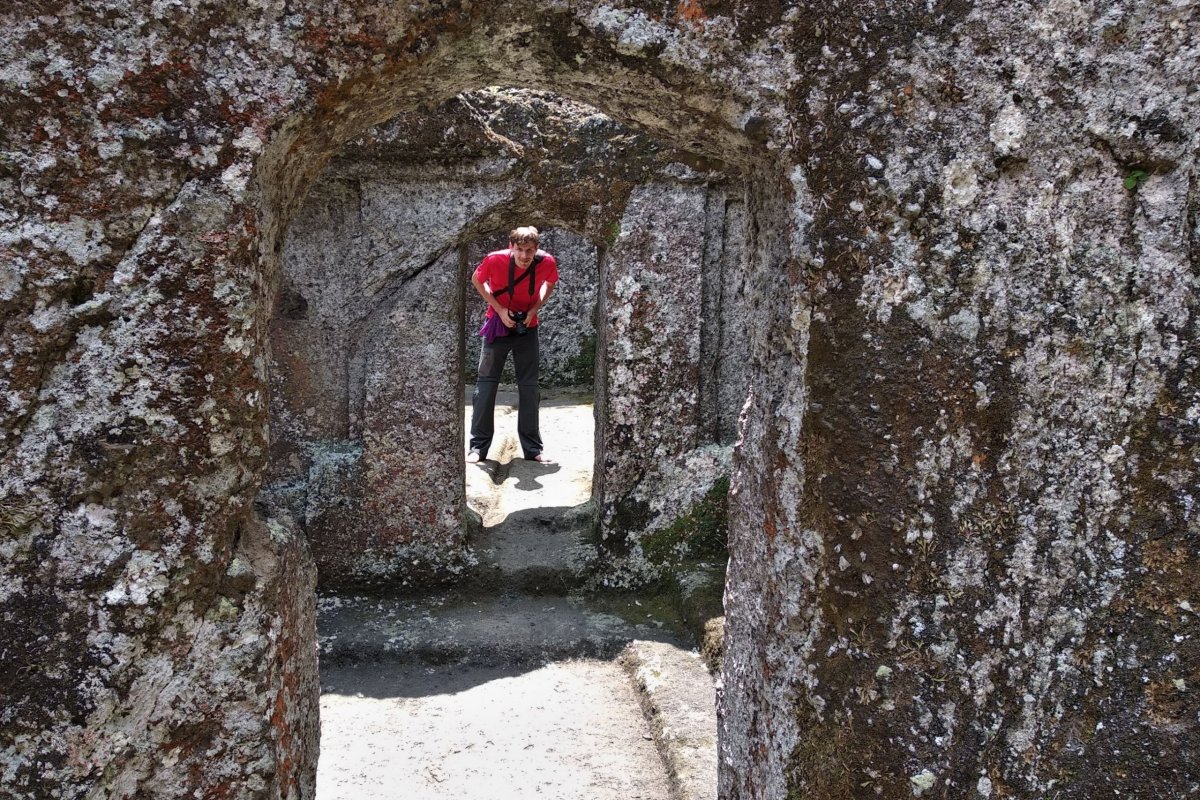 Po schodech klesáme do rozložitého údolí pokrytého zelenajícími se políčky a roztroušenými svatyněmi. Areálem protéká divoká řeka, kterou po mostě překračujeme a prohlížíme si do skály vytesané hrobky. Údajně mají pouze symbolický charakter a žádné ostatky zde nikdy uloženy nebyly. Kromě hrobek si míjíme spousty kamenných zídek, bran a oltářků v typickém hinduistickém slohu. Po cestičce kolem malého vodopádu pak vycházíme na kopec, ze kterého lze celý komplex pěkně zhlédnout. Zaujaly nás střechy svatyní vyrobené z jakési chlupaté tkaniny nebo přírodniny - co to asi je?