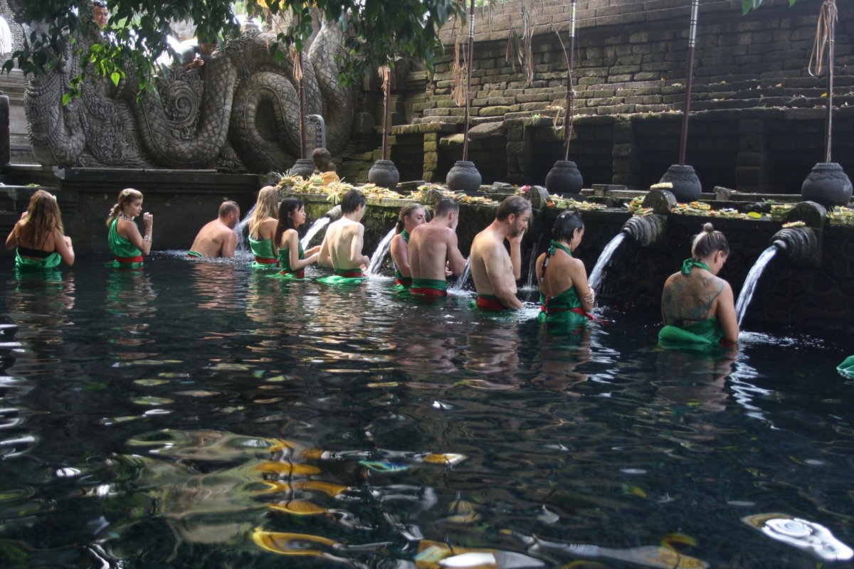 Uvnitř Tirta Empul je hodně lidí, jako fakt davy, a to jak místních, tak cizích. Komplex procházíme za půlhodinku, neboť po návštěvě předchozích chrámů tady není k vidění nic extra jiného. Pořád zakopávám o sarong, který zde musí mít uvázaný nejen návštěvníci, ale z nějakého důvodu dokonce i kamenné sochy. Chvíli sledujeme očistný rituál v křišťálově čistém jezírku. Lidé oblečení ve vypůjčených zelených hábitech procházejí pod chrliči se svatou vodou a u každého provádějí krátkou modlitbu. Chceme se vrátit stejnou nejkratší cestou ke skútru, ale na bráně nám oznamují, že východ je jinde - zcela náhodou vede skrze labyrint stánků se suvenýry :-) Vymlouvám se, že se chceme jen jít vyfotit támhle s tou sochou, a poté promptně bereme roha.