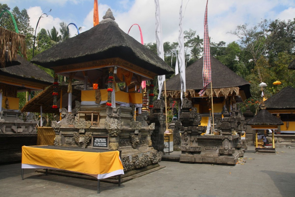 Přesouváme se do kilometr vzdáleného chrámu Pura Samuan Tiga. Projíždíme mohutnou kamennou bránou a úplně sami se procházíme mezi chrámy a svatyněmi. Má to tady úplně jinou “intimní” atmosféru a ze zdí doopravdy dýchá historie - chrám byl založen již v 10. století, ale je úžasně zachovalý a citlivě restaurovaný. Zároveň lze podle aktuálního obsahu nástěnek poznat, že se místo aktivně užívá k obřadům. Už jsme na odchodu a v tom z jedné budovy vylézá místní správce/duchovní a zdálky na nás volá. Mírně nás napomíná, že nemáme uvázané sarongy (dlouhé kalhoty v hinduistických chrámech z nějakého důvodu nestačí) a vybírá od nás drobný milodar.