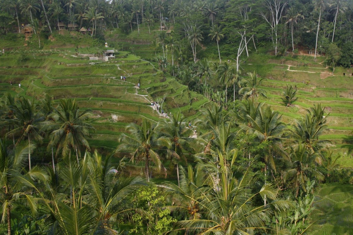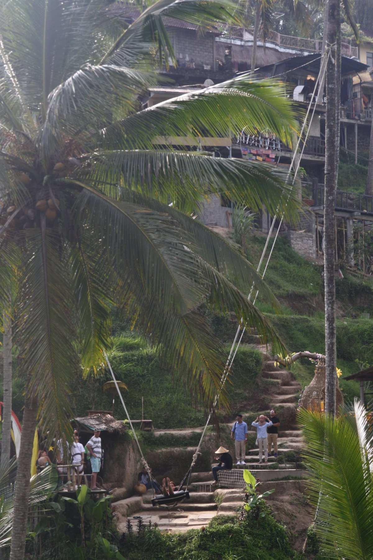 Na závěr výletu navštěvujeme rýžové terasy Tegallalang. Doteď nevím, jestli k nim z hlavní silnice vede nějaká oficiální cesta. My jsme prošli skrze drahé vyhlídkové restaurace a kolem obří houpačky. Stejně tak nechápu, jestli se něco oficiálně platí za vstup nebo ne. Narážíme na pána ve stánku, který vybírá dobrovolný příspěvek prý na údržbu teras. Pár šupů mu do kasičky házíme výměnou za poměrně oficiálně vypadající vstupenky. O pár kroků dále ale narážíme na další “kasu”, kde po nás paní chce totéž. Dál se nám stejně jít nechce, tak se s ní nehádáme a jdeme zpátky. Terasy jsou sice krásné, ale kdybych si měl vybrat, tak bych radši navštívil jen Jatiluwih.