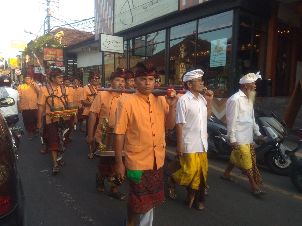 Cestou domů se na 15 minut úplně zastavuje provoz. Městem za zvuků prazvláštní hudby prochází mnohasethlavý průvod slavnostně nastrojených Balijců. Vypadá to tu jak na prvního máje, akorát převládá oranžová a žlutá barva místo rudé. Když se provoz opět začne hýbat, vracíme se k naší oblíbené bojové hře po městě "najdi bankomat co vydává peníze". Tentokrát vyhráváme na sedmý pokus :-) Večer už jen rezervujeme bydlení na příští dny a jdeme si odpočinout na zítřejší přesun na Nusa Penida.
