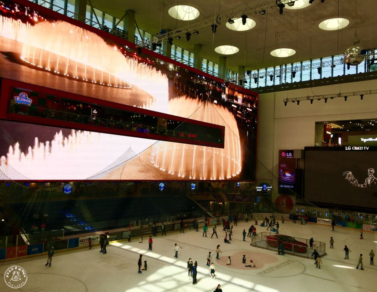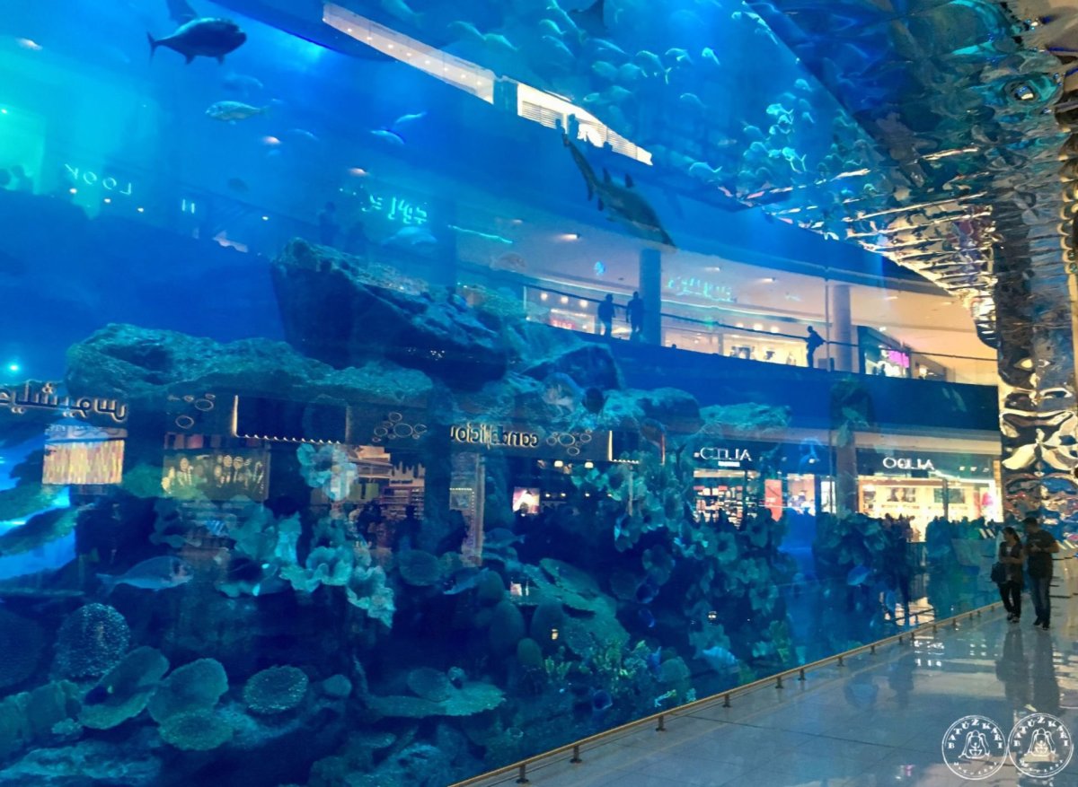 Z metra jsme vystoupili do alespoň kilometrové klimatizované chodby. Uvítali jsme jezdící podlahu, protože naše batůžky byly čím dál tím těžší. Pohon zdarma skončil až v Dubaimallu. Tam jsme viděli, to co je běžně v každém obchoďáku k vidění. Vodopád s padajícími sochami, ledovou plochu s autem uprostřed a akvárko se spoustou tropických rybiček, žraloků a mant, a dalších několik tisíc obchodů.
