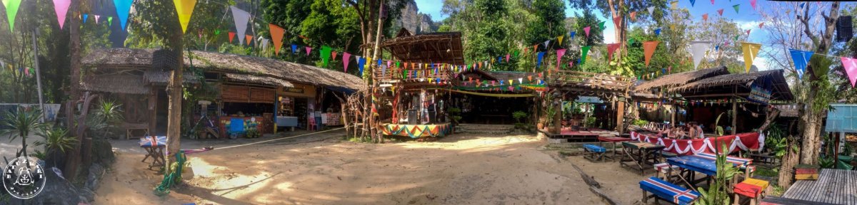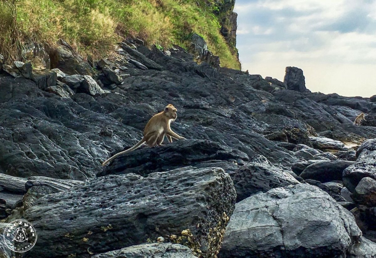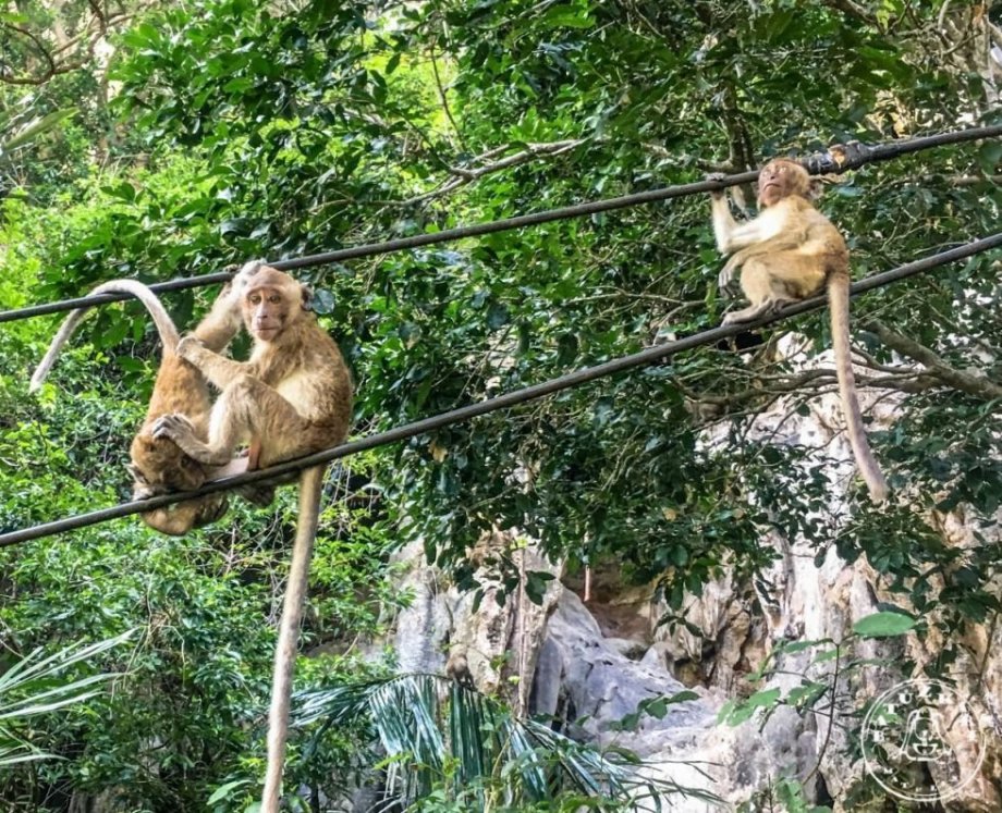 Celý komplex resortů, tady na Tonsay beach, je obklopen vápencovými skalami. Přístup sem je pouze lodí. Na každém rohu je tu cítit marihuana. Cesta do Chill out baru vede kolem oplocené palmové obory, skoro jak Berlínská zeď 🙂 ,kde, jak jsme se dočetli, obnovují původní faunu a floru. Šli jsme kolem skal, kde na každém kroku byli slyšet, vůbec ne vidět, horolezci, kteří zdolávali zdejší vrcholy. Celou cestu nás doprovázely opice.