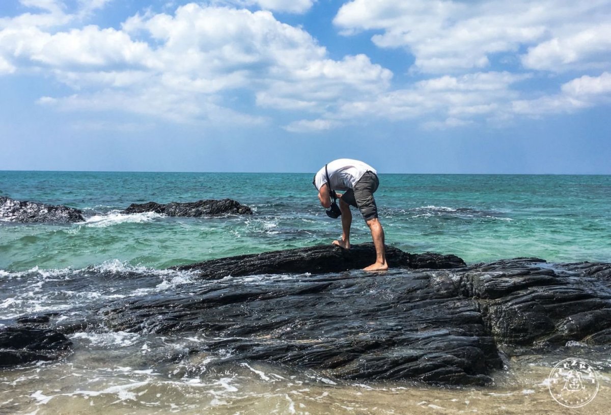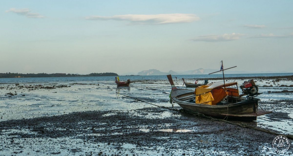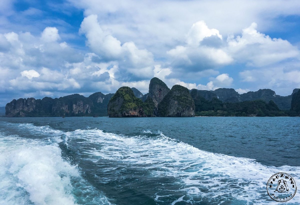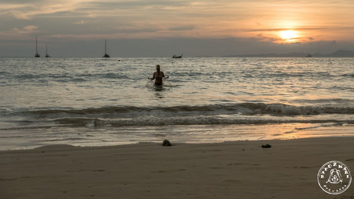 Úbytko jsme opustili brzy, dali jsme si lívancovou snídani a šli natočit na pláž posledních pár záběrů dronem. Jak to tak bývá, když vás něco baví, zapomněli jsme na čas a nastaly fofry. Byl příliv, a to „sakra“ příliv. Tím, že takhle brzy jsme na pláži byli vlastně poprvé, jsme ji konečně viděli plnou vody. To znamenalo, že cesta na Railay bude džunglí. Tu už jsme znali, tak nás nemohlo asi nic překvapit. Což byl omyl. Poslední kousek sestupu na pláž vedl přes skálu, která normálně v poledne leží na suché pláži, ale teď ráno, byla do půlky zatopená vodou. A kdyby jen vodou, bylo to pěkně rozzuřené moře. Plavky jsme na sobě neměli a elektroniku v batohu jsme utopit nechtěli. Nebyla to pecka dostat se těch 15 metrů s baťohami na hlavách, ve spoďárech, s tričkama vykasanýma pod prsa a ještě nás do toho stresoval blížící se čas odjezdu. Nakonec jsme to ustáli, sice s odřeninami, to jak si s námi skála pohrávala, ale dorazili jsme včas.