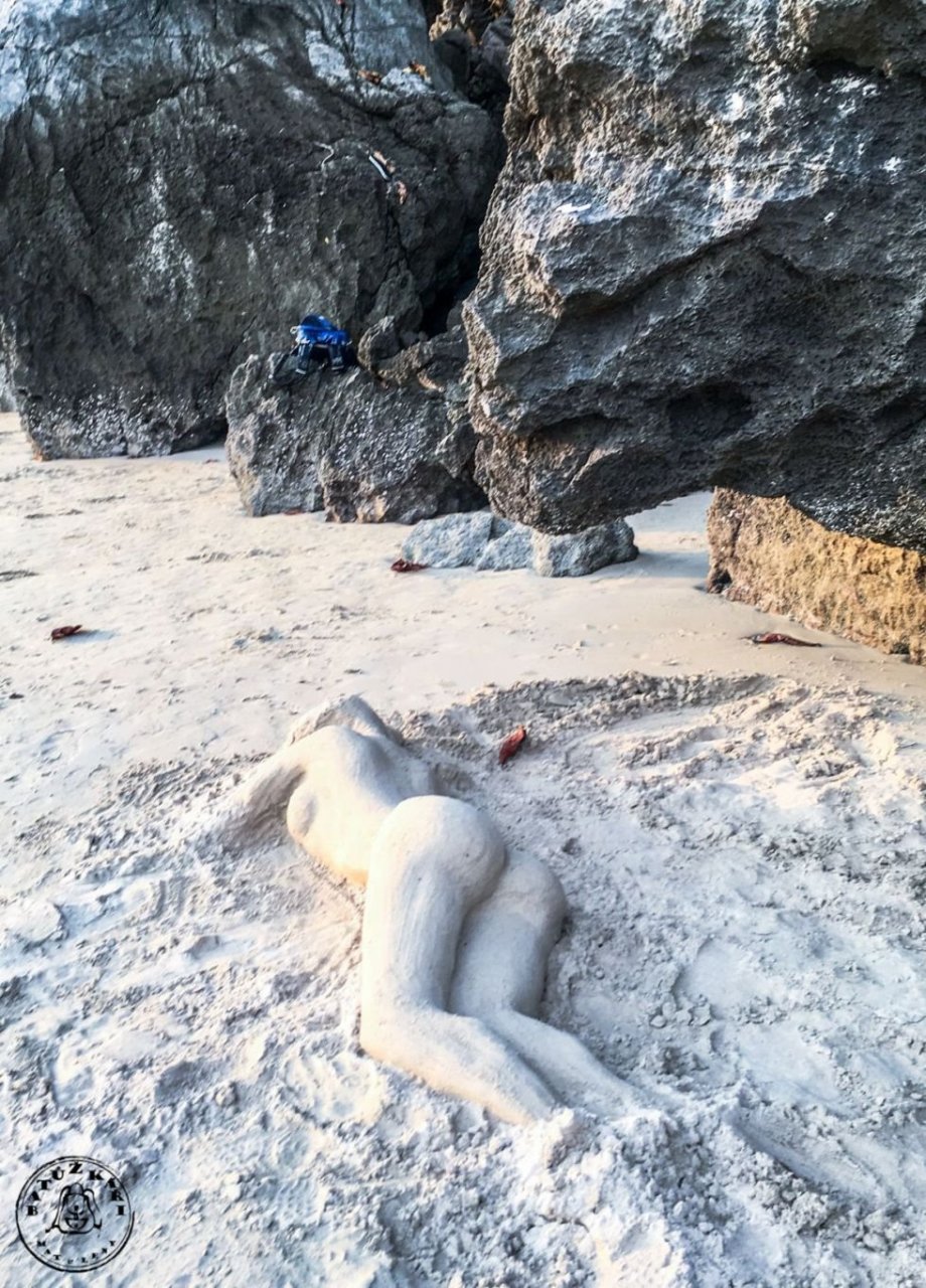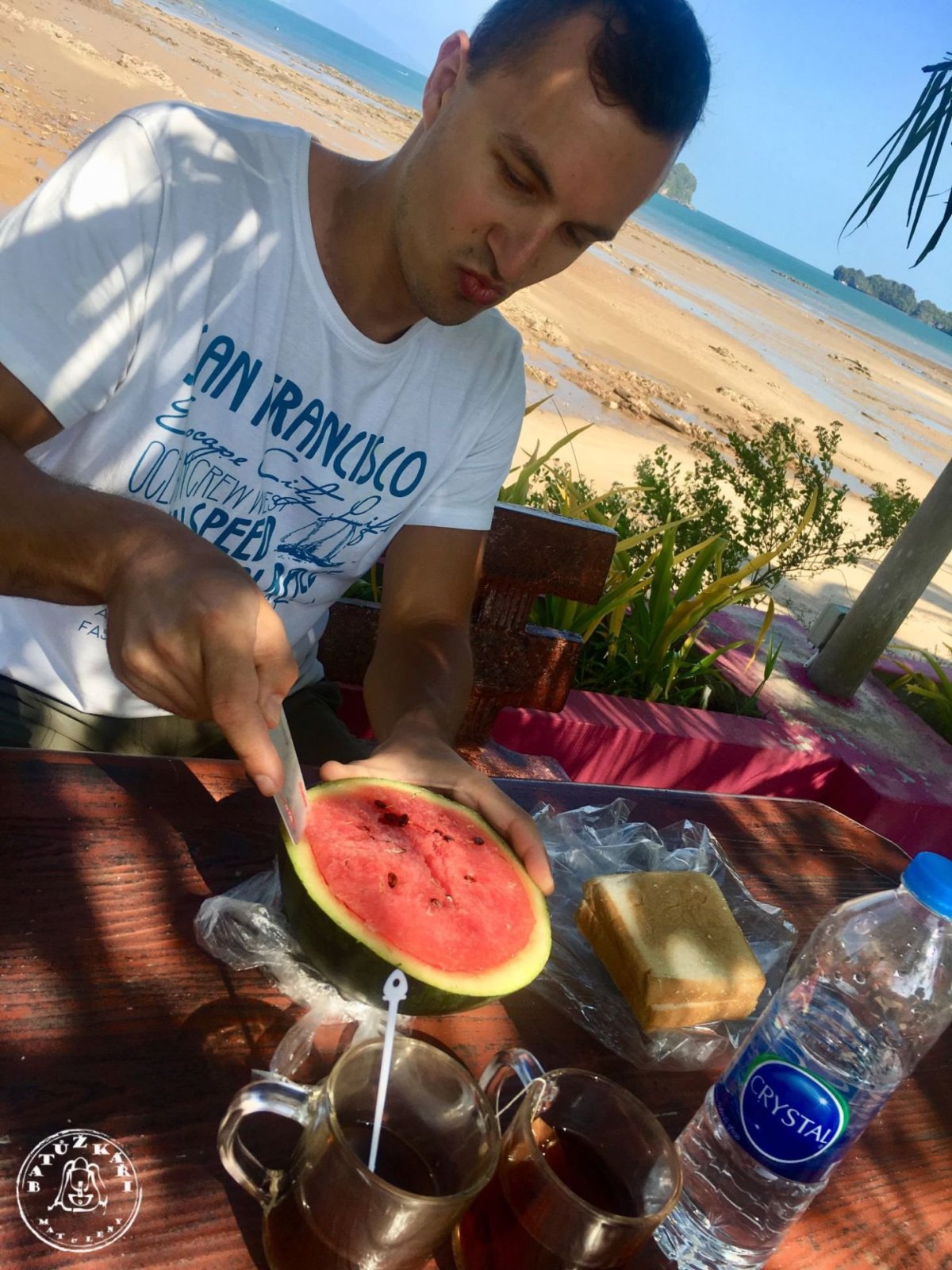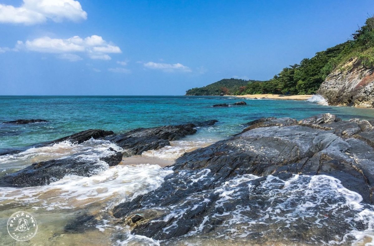 Úbytko jsme opustili brzy, dali jsme si lívancovou snídani a šli natočit na pláž posledních pár záběrů dronem. Jak to tak bývá, když vás něco baví, zapomněli jsme na čas a nastaly fofry. Byl příliv, a to „sakra“ příliv. Tím, že takhle brzy jsme na pláži byli vlastně poprvé, jsme ji konečně viděli plnou vody. To znamenalo, že cesta na Railay bude džunglí. Tu už jsme znali, tak nás nemohlo asi nic překvapit. Což byl omyl. Poslední kousek sestupu na pláž vedl přes skálu, která normálně v poledne leží na suché pláži, ale teď ráno, byla do půlky zatopená vodou. A kdyby jen vodou, bylo to pěkně rozzuřené moře. Plavky jsme na sobě neměli a elektroniku v batohu jsme utopit nechtěli. Nebyla to pecka dostat se těch 15 metrů s baťohami na hlavách, ve spoďárech, s tričkama vykasanýma pod prsa a ještě nás do toho stresoval blížící se čas odjezdu. Nakonec jsme to ustáli, sice s odřeninami, to jak si s námi skála pohrávala, ale dorazili jsme včas.