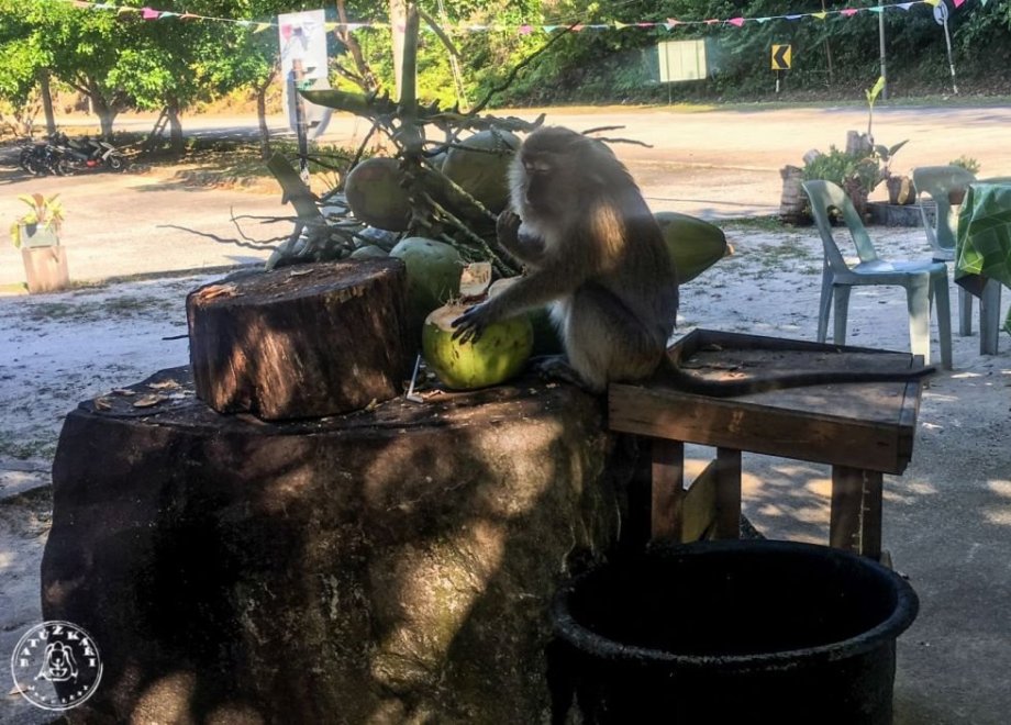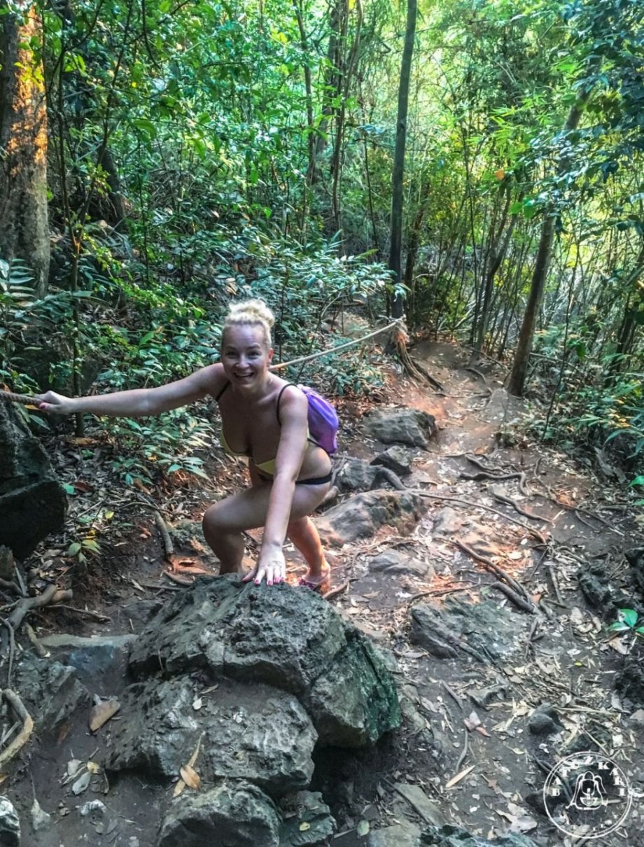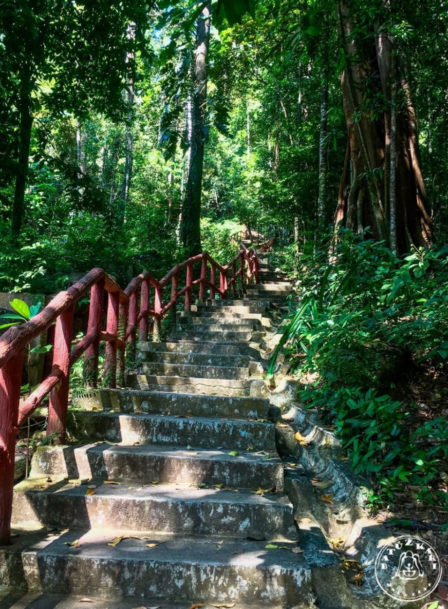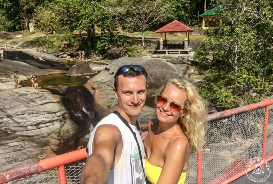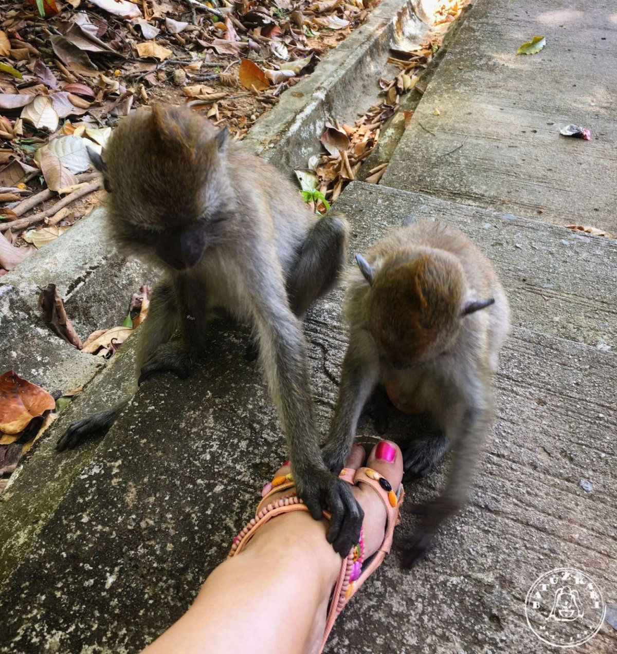 Na parkovišti jsme zaplatili 2MYR parkovné. Všude tady posedávali opice, bylo to legrační. Z parkoviště vede asfaltka, která je tak strmá, že pochybuju o tom, že tam nějaké auto vyjede. Vede kolem několika stánků s oblečením i občerstvením do hor. Pak závora, silnice končí a následují schody. Spooooousta schodů….Prý je jich 638, ale to jsme teda nepočítali. Vystoupá se deštným pralesem až do výšky 480m n m. A zase všude kolem spousta opic, některé vypadali i rozlobeně. Ty jsme obcházeli. Jedna chtěla dokonce i moje korálkový pantofle. Každopádně asi po 20minutách stoupání po schodech jsme z nich odbočili doleva a přišli jsme k vodopádu. Ten má spád 65 metrů. Byla tam spousta lidí. Mládež se tam předháněla ve skocích do jednoho z jezírek. Chvíli jsme zůstali, udělali pár fotek, Matěj prubnul vodu a po chvilce oddechu jsme pokračovali dál vzhůru.