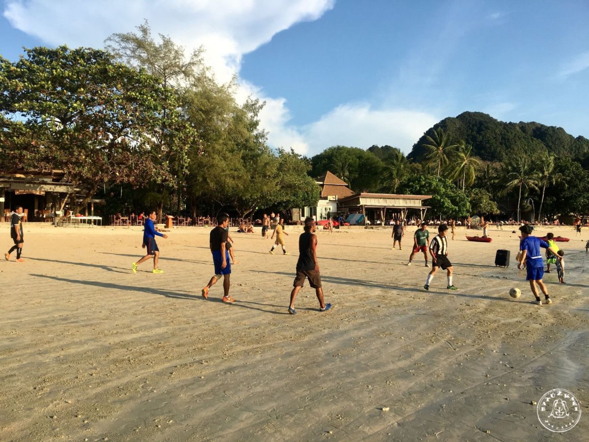 Přišli jsme k moři a ono tam nebylo. Odliv nám umožnil přejít na další pláž skoro suchou nohou, jinak vedla cesta přes džungli, po vyšlapané kluzké cestě po skalách a kořenech. Celé odpoledne jsme si užívali sluníčko, váleli se ve zbytku moře a pozorovali místní fotbalový zápas. Railay beach se hodně liší od “té naší”. Tonsai beach je malá, jakoby zapomenutá v čase, s jedním barem a naopak Railay je přeplněná lidmi, stánky s jídlem, bary a resorty sahajícími i s bazénem až k pláži. Mají tu za to ale moře i když je odliv, což Tonsai nemá, a díky tomu odsud taky startuji lodě na výlety. Což je dobré vědět, protože na Tonsai bychom na naší loď, kterou máme odplout, čekali zbytečně. Skutečný plavání jsme si užili až při západu slunce, kdy se moře vrátilo. To ale znamenalo, že zpět, už jsme bohužel museli džunglí. Žádná legrace to nebyla. Noční procházka džunglí, kde nevíte kam šlapete, noční zvuky, které neznáte, a cesta, která snad nekončí, byla taková doufám poslední. Zabalení a připravení na zítřejší přeplavbu na Lantu, jdeme na večeři. Tentokrát jsme si dali střídmou večeři. Salát. Sice nám do něj nabízeli přidat “houbičky”, ale ubránili jsme naše jídlo a i bez houbiček bylo výborný.
