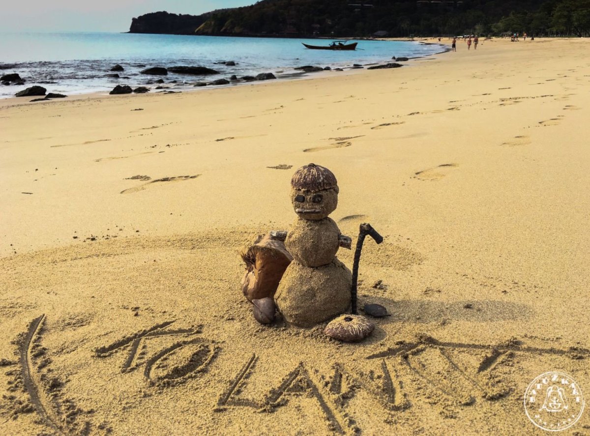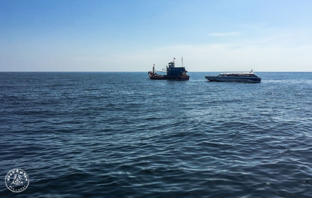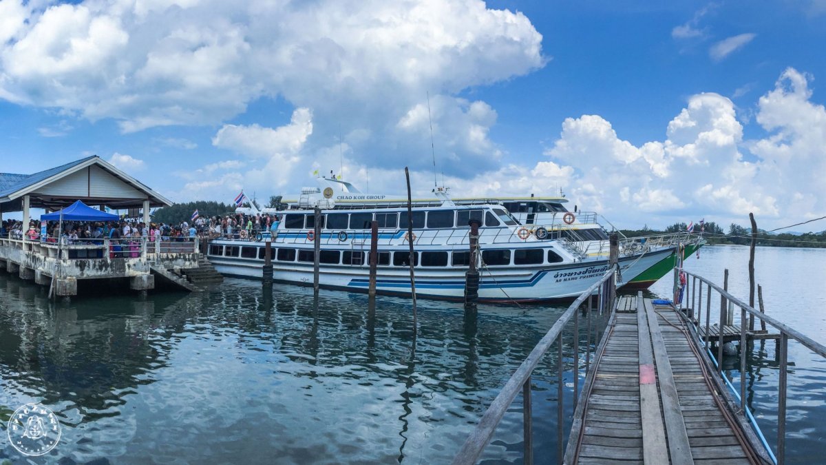 Krásný terminál… 🙂 Byl to ohraničený kus pláže s nádherným bílým pískem a nízká budova s jedním okýnkem, kde sedí celník. Batohy vidět nechtěli, jen pasy. Pašovali jsme jen meloun a tousťák. Dalších cca 30 min jsme čekali než se sjedou lidé ze všech koutů thajska, všechny je odbaví a pak nás zase odvezli zpět na příslušnou loď. Zase podle nálepek. Zbytek plavby už byla pohodička. Loď byla krásně klimatizovaná a byla dokonce televize, sice běžel nějaký katastrofický film s tsunami, ale super.