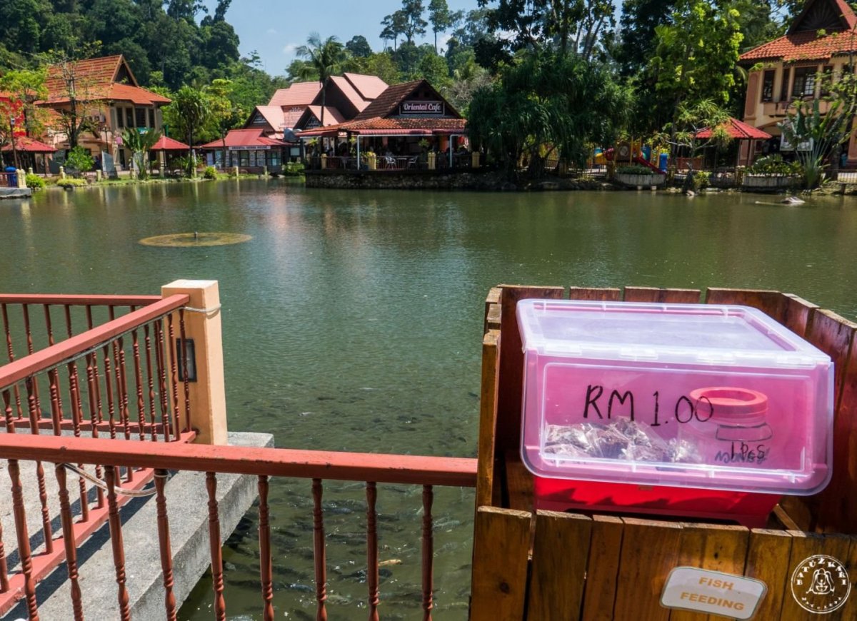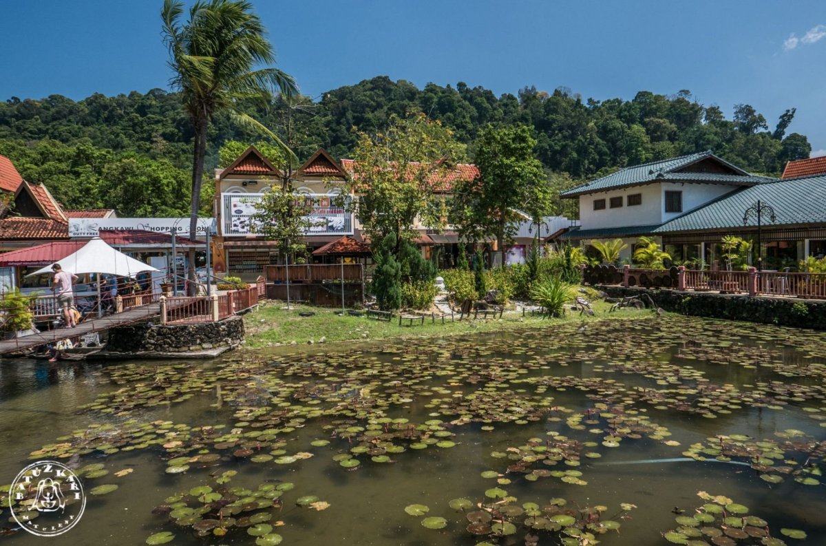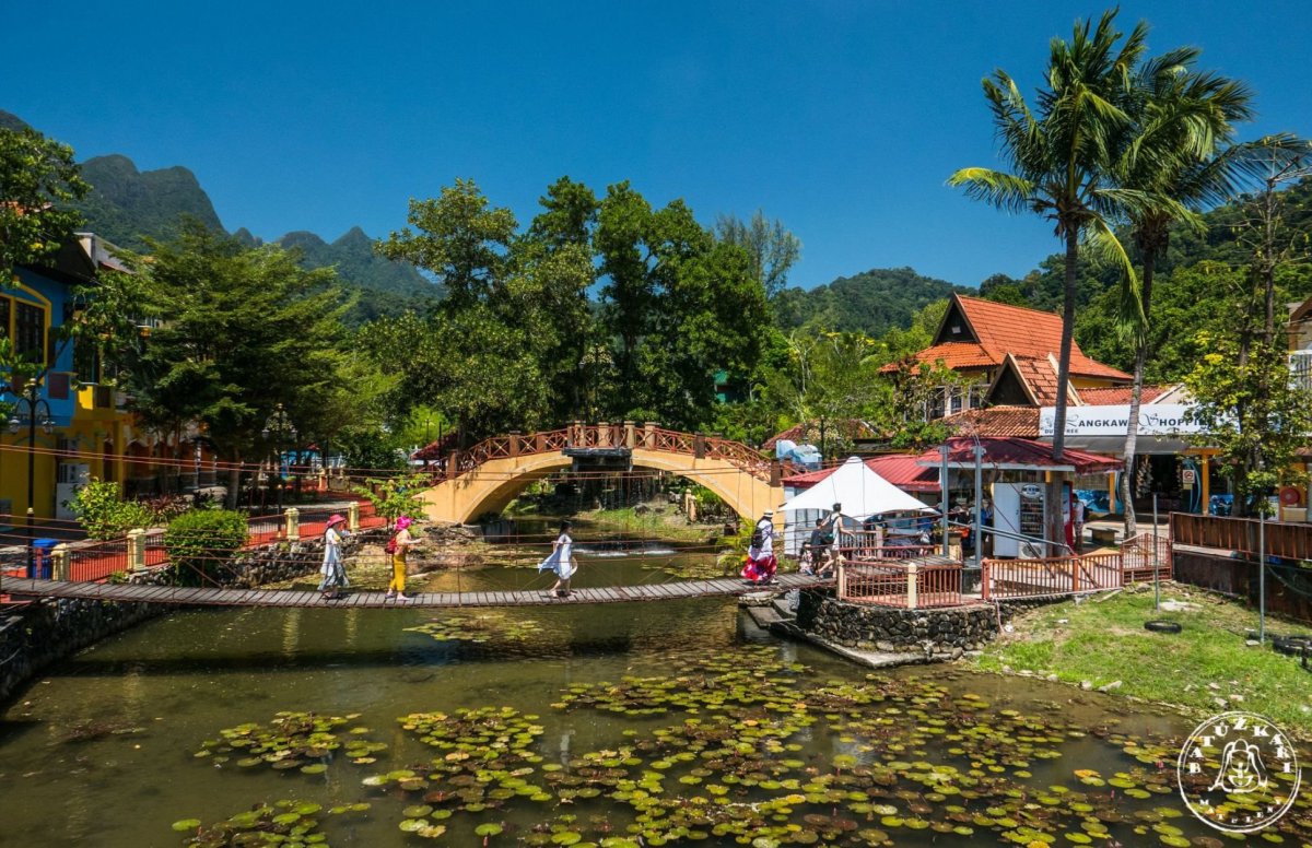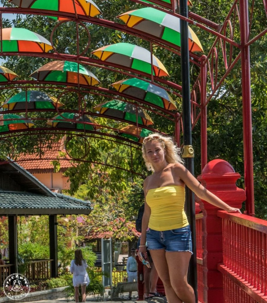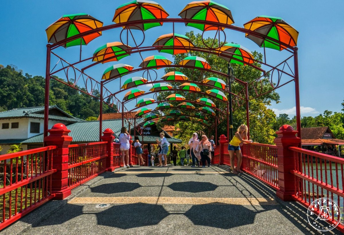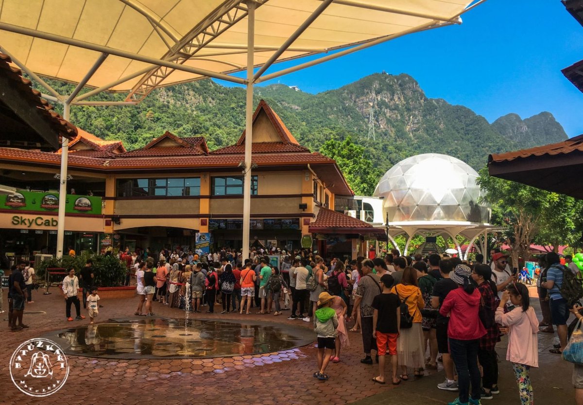 Pod dolní stanicí lanovky je parkoviště se spoustou krámků, ať už s jídlem nebo drobnostmi tipu, žabky, brýle apod. Ovšem ceny závratné. Do samotného areálu je postavena krásná vstupní brána, hned za ní pak procházíme uličkami obklopené moderně vystavenými obchůdky se suvenýry, s různými dekoracemi zhotovenými z čehokoliv, samozřejmě nechybí občerstvení, zmrzlina, tématické oblečení i žabky a téma samozřejmě Sky Bridge nebo Langkawi. Je tu i jezírko a kolem lavičky na pozorování rybiček v něm. Vstupenky koupíte přímo před vstupem do lanovky. Poznáte kde, jsou tu i ukazatele, ale podle masy lidí stojících ve frontě to najdete i bez nich. Obyčejné jízdné je 55MYR, ale samozřejmě vydělávat se musí na všem a za komfort se platí, tak i tady nechybí luxus v podobě soukromé kabinky, přednostního nástupu po červeném koberci, a dokonce je tu kabinka s proskleným dnem. Ale to je pro opravdu silné povahy.