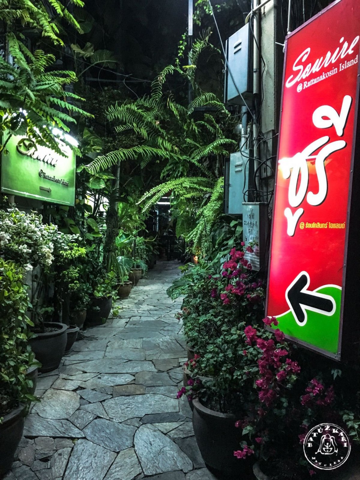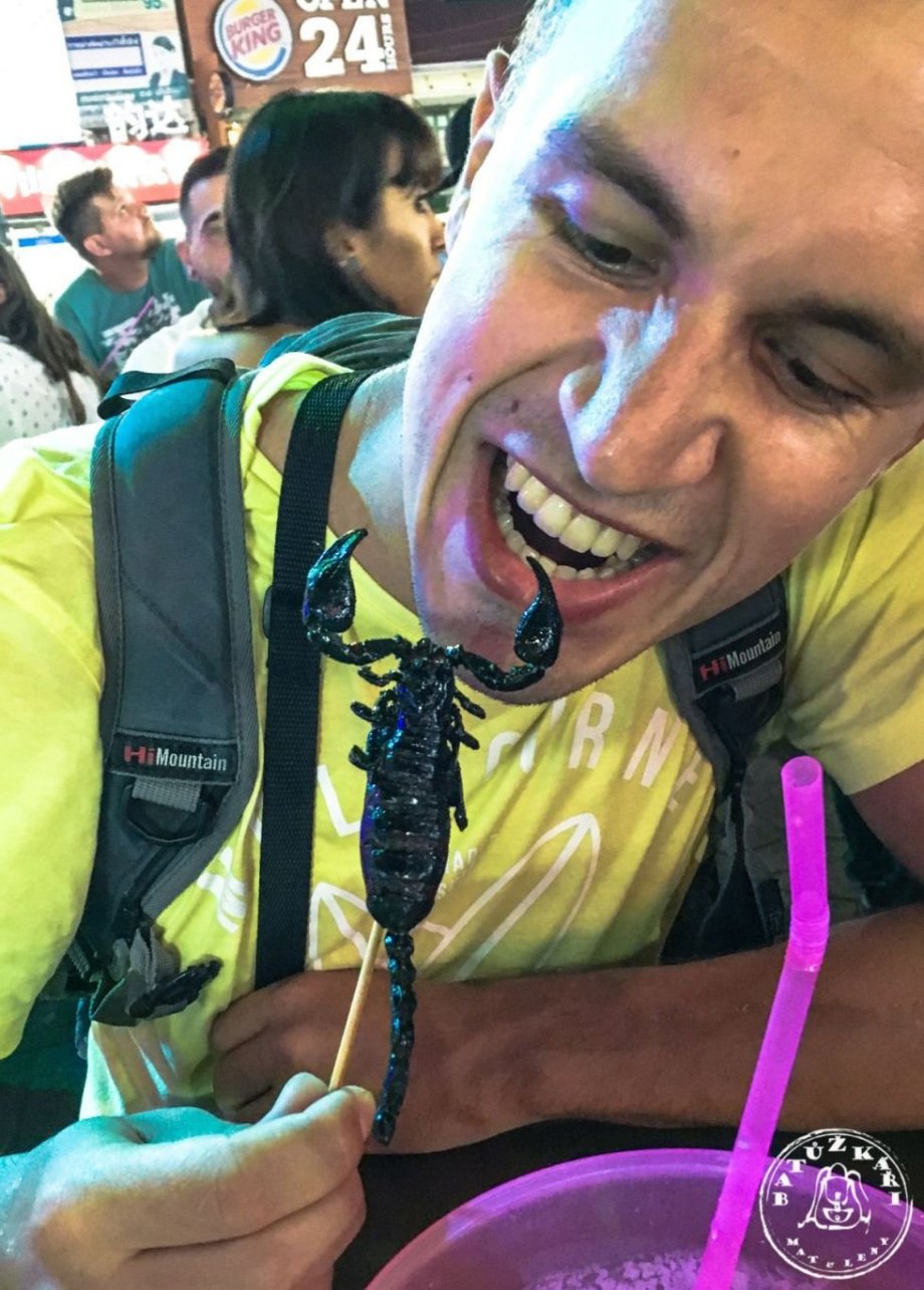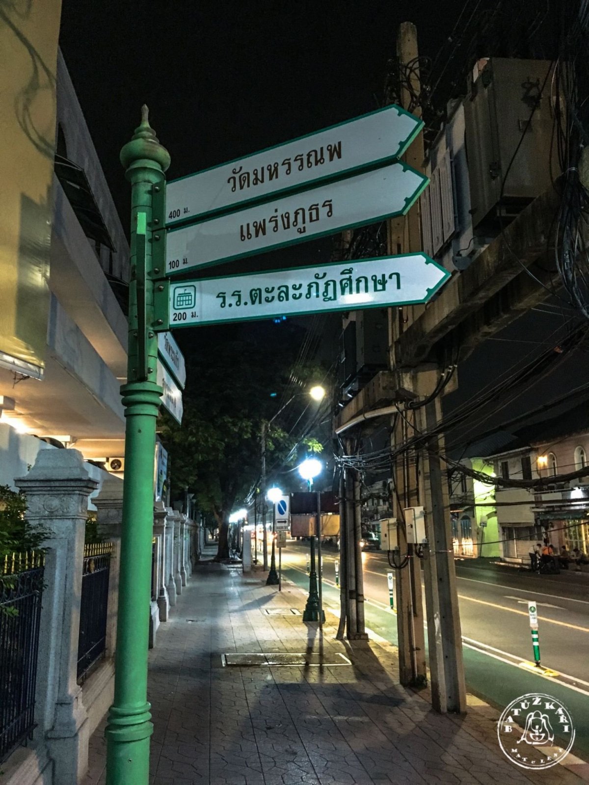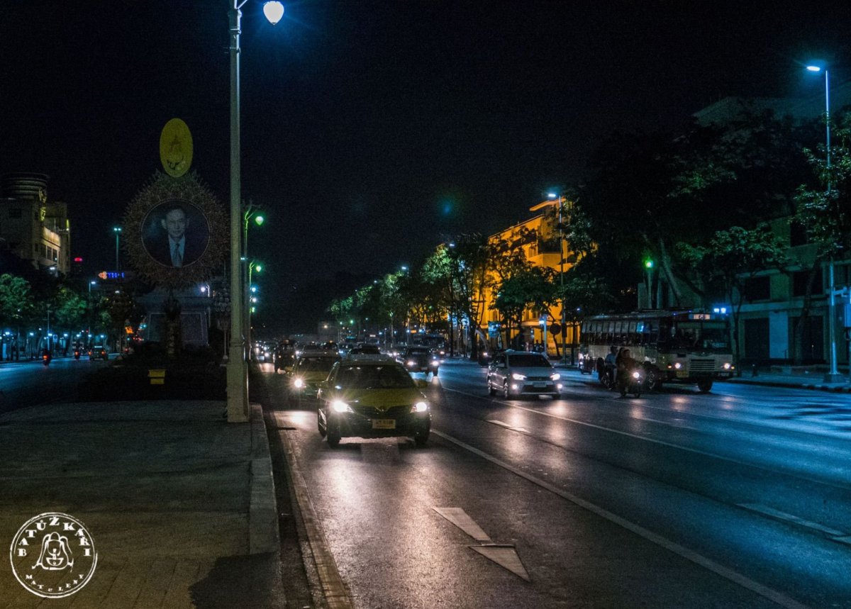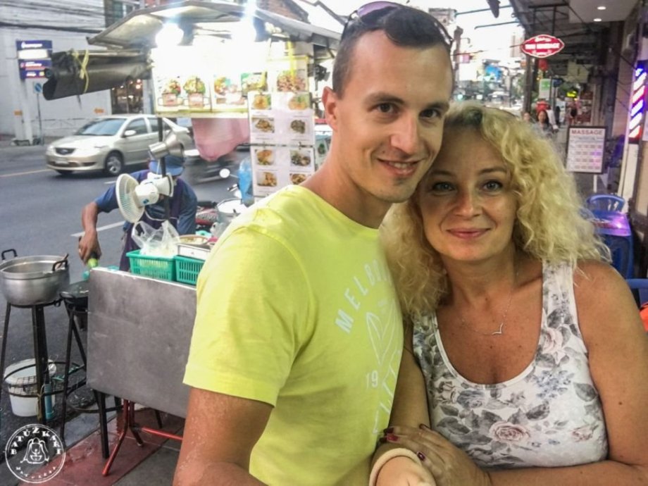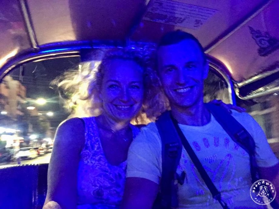 Chceme se dostat co nejdřív do úbytka, shodit batohy a vyrazit za něčím mňamky thajským. Taxíci jsou neuvěřitelně drahý. Ale našli jsme tu stánek, který dělal autobusový okruh Bangkokem a byli celkem levní. Vyšlo to skoro o polovinu méně za oba než taxík. Mělo to jen jednu nevýhodu. Vyjel až se zaplnila všechna místa v buse. No nic, dali jsme kávu a čekali. Ještě vlastně jedna nevýhoda. Cestou jsme museli na mapách sledovat kudy jedeme a nejblíže místa úbytka vystoupit. Vystoupili jsme rovnou u pojízdného stánku s jídlem. Vybrali jsme podle obrázků a pán uvařil přímo před námi. Dostali jsme vynikající jídlo na umělohmotných talířcích. Pak už nás navigace vedla do úbytka. Hotel Sourire @ Rattanakosin Island.Dali jsme sprchu a vyrazili do nočního Bangkoku. Vrátili jsme se až pozdě večer. Největší zážitek bylo asi Matějovo pojídání smažených štírů, které jsme si i jako dárky pro rodinu odvezli domů.