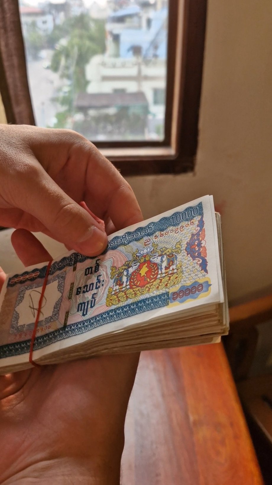 Měníme 400 USD a dostáváme asi 1,1 milionu kyatů. Problém s kyatama je ten, že myanmarská národní banka se velmi zdráhá vydávat vyšší a vyšší nominály tak, jak se snižuje hodnota měny a tak dostáváme vše v desetitisícových bankovkách. K paklíku peněz dostaneme i igelitku. Srandovní. Nejnižší užívaný nominál je 50 kyatovka – ta má hodnotu asi 40 haléřů. Tu jsme ale použili jen párkrát, když jsme si šli koupit pytlíček instantní kávy za 250 MMK. V Myanmaru se de iure nestahují bankovky z oběhu, ale jen se počká až prostě ztratí hodnotu úplně, což mimo jiné i znamená, že jsou v katastrofálním stavu a někdy tak špinavé, že jen stěží lze vyčíst jejich hodnotu. Toliko zatím k problematice peněz v Myanmaru v roce 2023. Pojďme se podívat blíže na další problém, se kterým se Myanmar potýká – nedostupná elektřina.