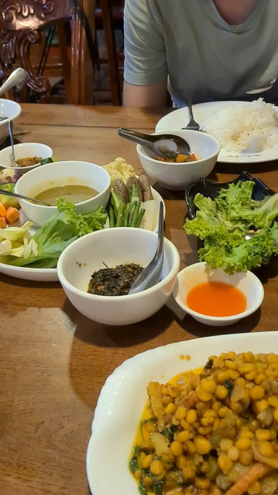 Večer zamíříme do vyhlášené barmské restaurace. Obecně je jídlo v Myanmaru povedeným hybridem mezi thajskou, čínskou a indickou kuchyní. Jedním z národních pokrmů je kari, které si dnes objednáváme. Dostaneme na stůl spoustu mističek se zeleninou a omáčkami a k tomu si navíc objednáváme vepřové v sójové omáčce a fazole. V ceně je i neomezená rýže. Tradičně se jídlo sdílí s ostatními strávníky u stolu, každý má svůj talíř s rýží a na něj si nakládá z mističek na co má chuť. Za velmi povedenou večeři platíme okolo 30000 MMK tedy asi 11 USD i s pitím.