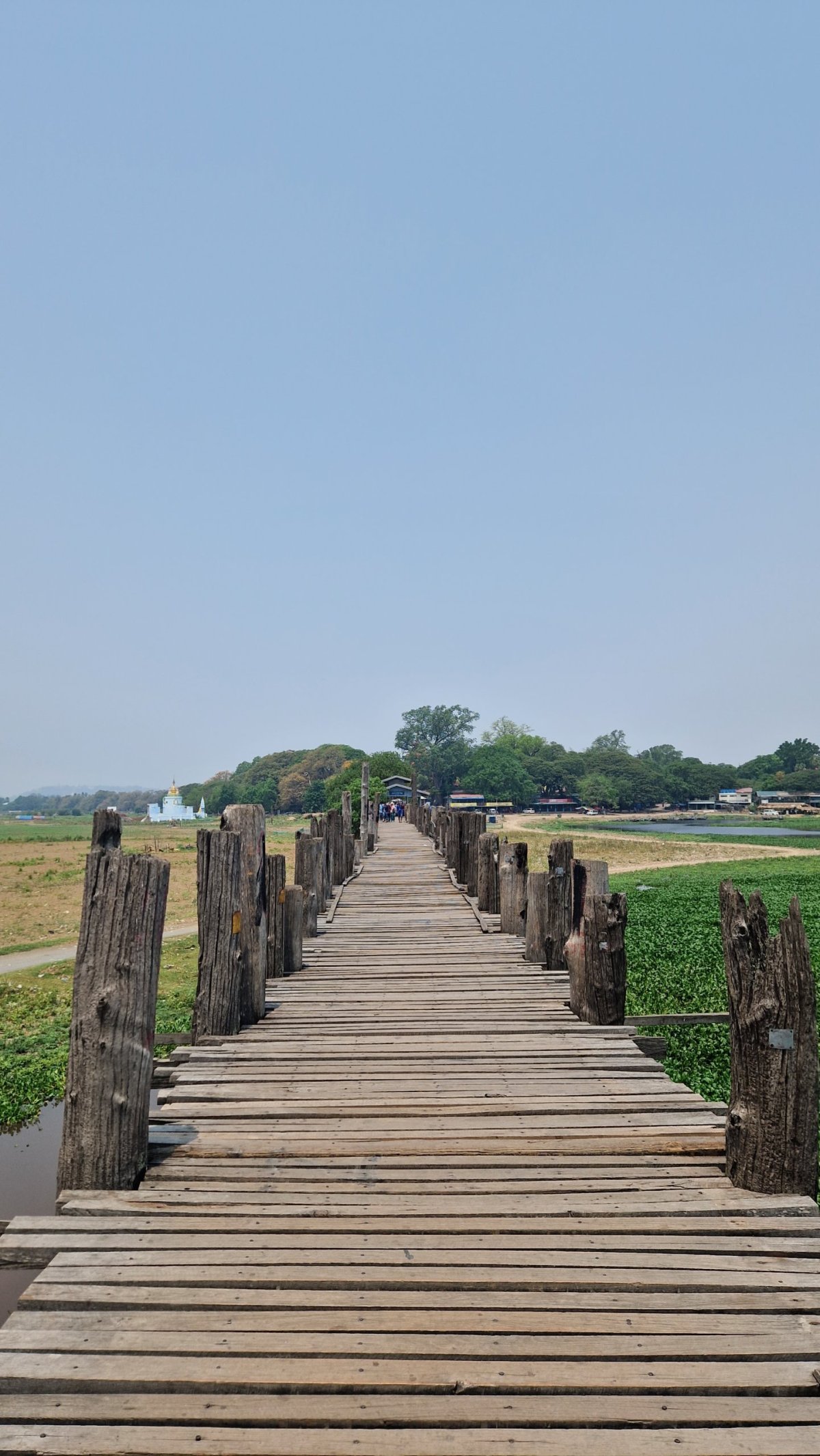 Cílem naší cesty je most U-Bein zvláštní svými pilíři – prý nejdelší svého druhu na světě. V okolí mostu je hodně stánků prodávající „suvenýry“. Nevím, jak to vypadalo předtím, ale dnes stánky nabízí hlavně budhistické předměty, oblečení a různé předměty do kuchyně většinou vyrobené ze dřeva. Sortiment tedy zcela jasně míří spíš na domácí zákazníky. Suvenýry typu magnetky na ledničku je v Myanmaru problematické sehnat. Možná důsledek masivního odlivu zahraničních návštěvníků.