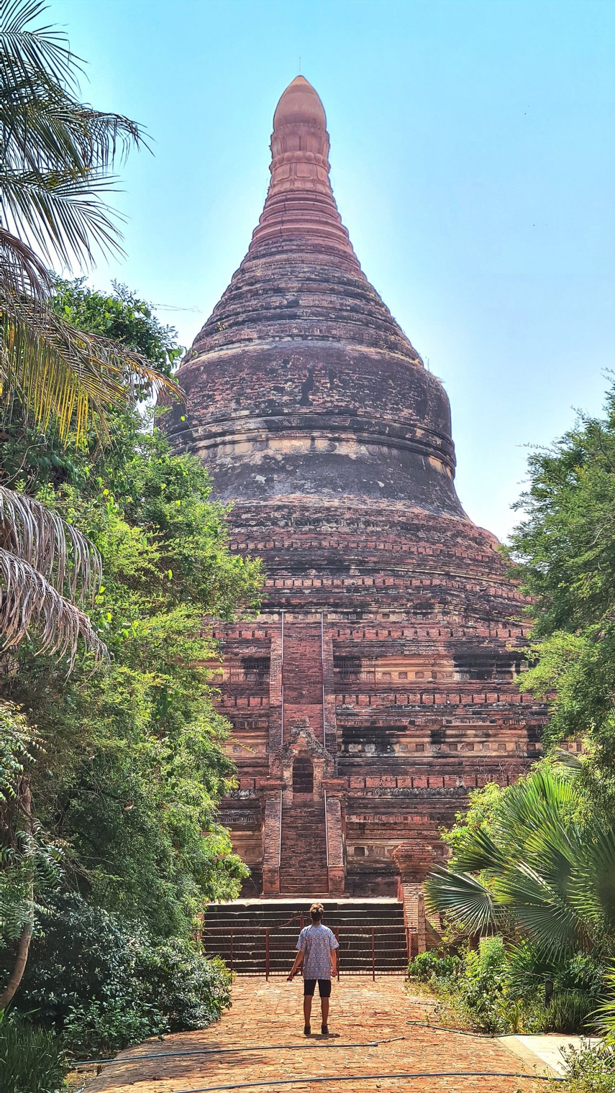 V Baganu bydlíme v hotýlku s bazénem, což se fakt hodí, vedra jsou tu opět i okolo 40°C. Bagan je slavný budhistickými chrámy a stupami, které jsou rozeseté po území velkém několik kilometrů čtverečních, dohromady jsou jich tisíce, ale reálně má význam z blízka si prohlédnout desítku největších. Chrámy se dají objet nejsnáze na elektrických skútrech, ty mají omezený dojezd, v důsledku čehož nám unikne výhled na západ slunce, protože nám musí dovést jiný, nabitý. Standartně se už při vstupu do města platilo vstupné 25000 MMK, jenže s poklesem turistů už se přestalo vyplatit provozovat pokladnu, takže máme vstup do Baganu zadarmo.