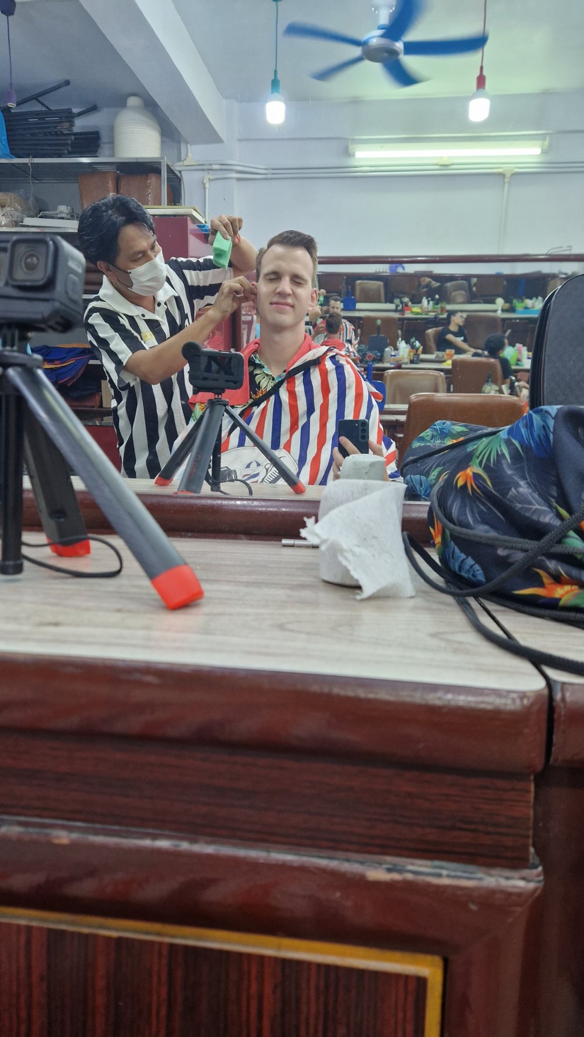 Míříme si dát sprchu do hotelu, po krátkém odpočinku jdu k holiči. Různých barberů je po městě fakt hodně, já už mám vlasy dlouhý až až a nechat se ostříhat v Myanmaru může být zážitek. Holičovi ukážu obrázek toho, jak bych chtěl vypadat a on se pustí do práce. V ceně je i styling a asi minutová masáž hlavy. Bohužel neumí moc anglicky, ale hrozně se diví, co tam dělám. Vůbec kadeřnickému průmyslu nerozumím, ale nemám pocit, že by zde bylo něco dramaticky jinak než v Česku, strojek, hřebeny a sada nůžek. S výsledkem jsem spokojený. Platím 5000 MMK, tedy asi 40 korun, nechávám dýško další tisícovku, radost pana holiče je znát na první pohled.
