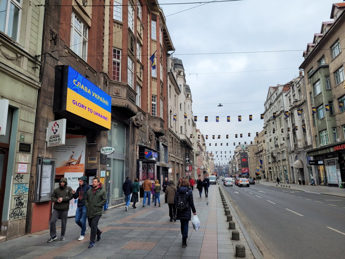 Notně zmáčený sněhem se před psem schovávám do kostela, po čtvrt hodince vycházím, pes nikde. Jdu na hlavní náměstí, kde ho opět potkávám. Bohužel i on mě. Tentokrát se schovávám do hospody a protože už je víceméně čas oběda, dávám si další skvělé čevapi. Zdržuji se co nejdéle. Jednak tu je sucho a jednak tu není cizí toulavý pes.