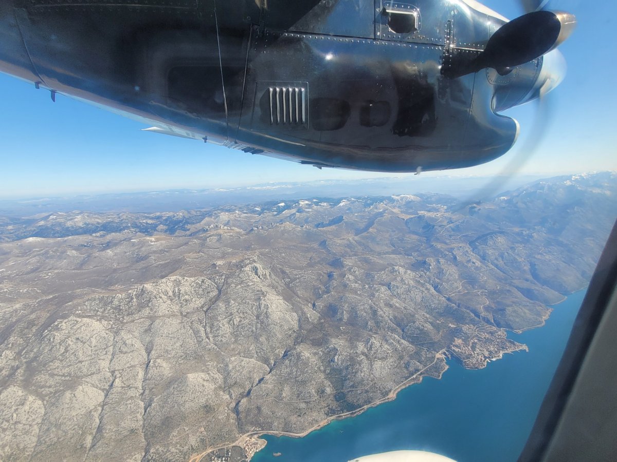 Následuje 45minutový let do Splitu, celý podél rozeklaného chorvatského pobřeží s horami v pozadí a desítkami ostrovů na obou stranách. V rámci Evropy jde určitě o jednu z nejhezčích vyhlídkových tras letadlem. Naše L-410 stěží vystoupá do 2 500 metrů, což je k výhledům naprosto ideální výška. Však posuďte sami: