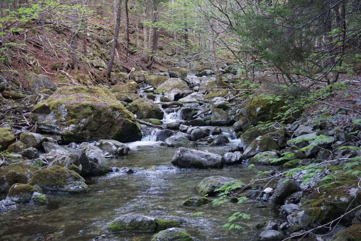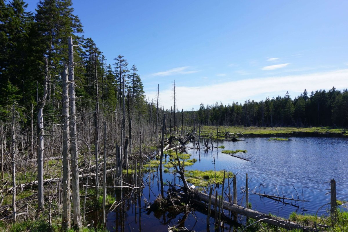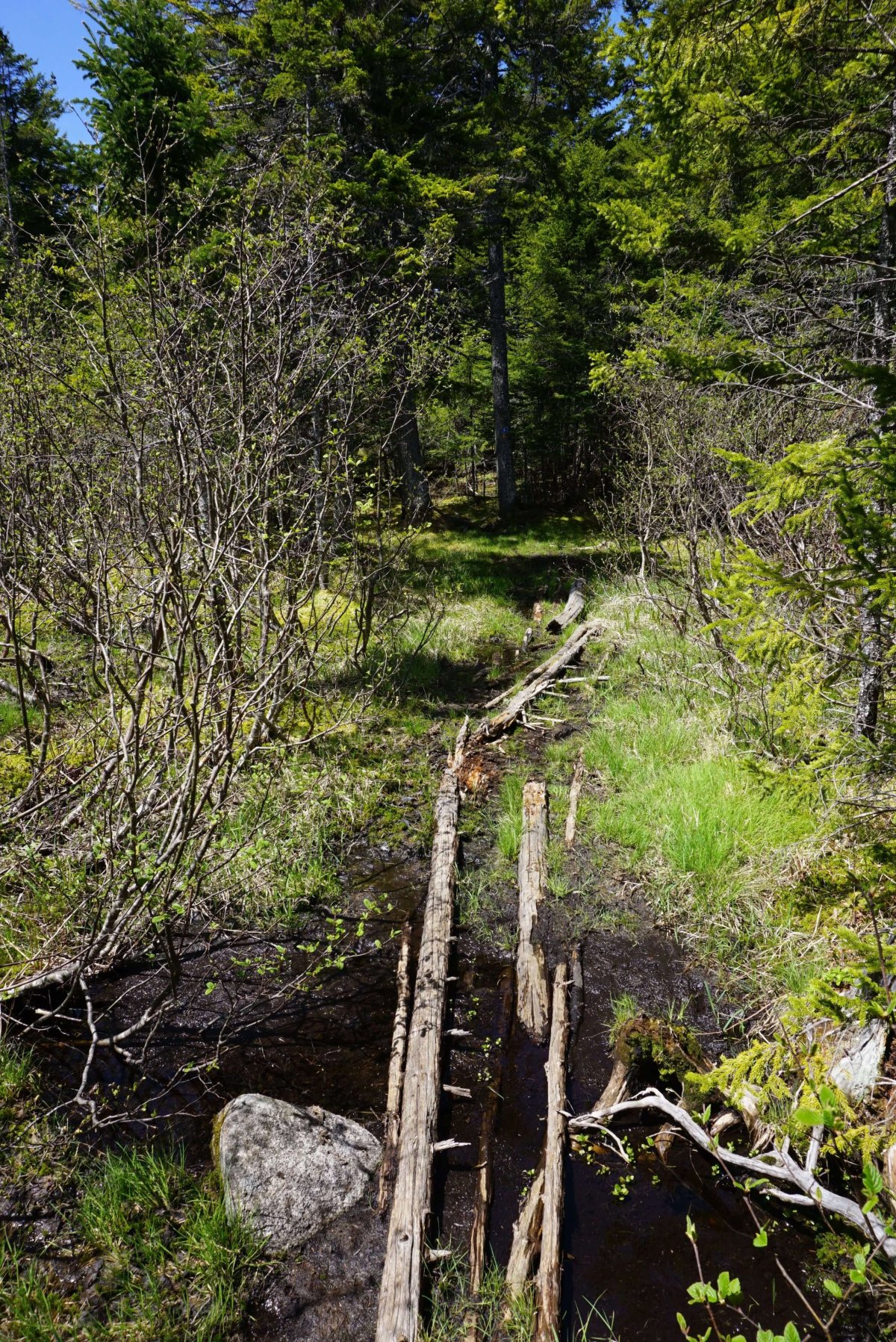 Vrátil jsem se do kempu, zabalil jsem batůžek a autem jsem vyrazil k začátku dnešní cesty - Bennett Lake. Místní kemp byl ještě opuštěný. Udělal jsem pár fotek a vyrazil jsem na cestu k Tracey Lake a Laverty lake, v mapě označené jako středně obtížné traily. Cesta byla dobře značená a opět vedla akádským pralesem. Okolí se neustále měnilo, takže bylo se na co koukat. Před cestou jsem četl deník z PCT, kde autor psal, jak se brodil studenými potoky. Tahle zkouška mě také čekala. Menší potok jsem přeskočil, další byl ale příliš široký. Vody asi po kolena, ale fakt se mi do ní nechtělo. Po chvíli váhání jsem našel delší větev a jako Sergej Bubka jsem vyrazil, zabodl ji do potoka a nepříliš ladně se přenesl na druhou stranu.