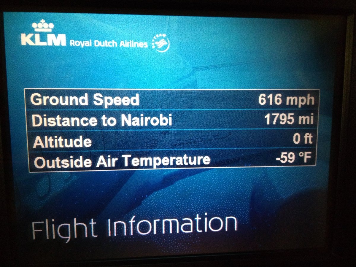 Před přistáním v Nairobi absolvujeme několik okruhů před letištěm a ve zbytcích večerního světla vidíme i siluety nejvyšší hory Afriky. V Nairobi opět několik kontrol, jedna dokonce navíc ve chvíli, kdy se při hledání toalety opět ocitám za jednou z nich. Ani při zpátečním letu KLM nezklame, palubní servis je opět velmi bídný. Výsledkem je, že naše žaludky tak musíme v Amsterdamu naplnit. A protože kdejaký kousek pečiva v pekárně je zde za 6é, tak ve finále volíme plnou palbu v Burger Kingu, kde mj. vedle v nějaké vege provozovně sledujeme Romana Vaňka s rodinou, šéfa Pražského kulinářského institutu.