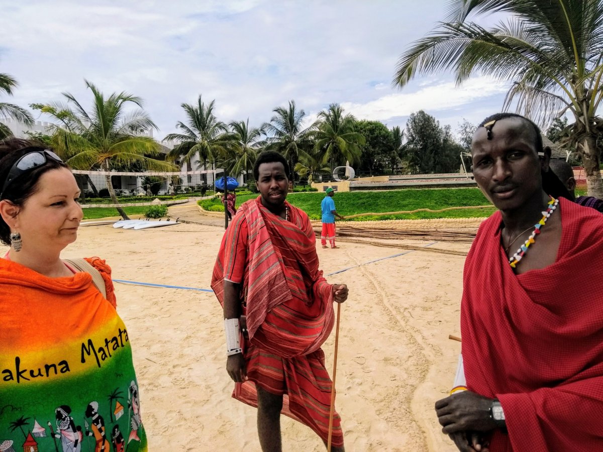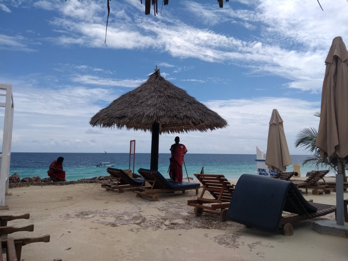 Po snídani jdeme okouknout pláž. Ta je parádní, prakticky prázdná a moře je hraje několika barvami modré. Místní prodavači obrazů, šátků a všemožných cetek, kteří se na nás vrhají, zde mají nad turisty také jasnou převahu. Pláže na Zanzibaru jsou veřejné, soukromý pozemek rezortu začíná až za ní a je hlídán místními Masaji oblečenými v typické červené. Takže pokud chceme mít klid od dotěrných prodejců, musíme se zdržovat až za nimi. Masajové jsou většinou mladí kluci a je vidět, že se tu při nedostatku turistů těžce nudí, naštěstí k nezbytné výbavě snad každého místního domorodce patří chytrý telefon, kterým tu nudu zahání. Naštěstí v té „záplavě“ turistů nás všichni místní prodejci po pár dnech znají, i náš nezájem o jejich zboží, takže nám pak později dávají pokoj.