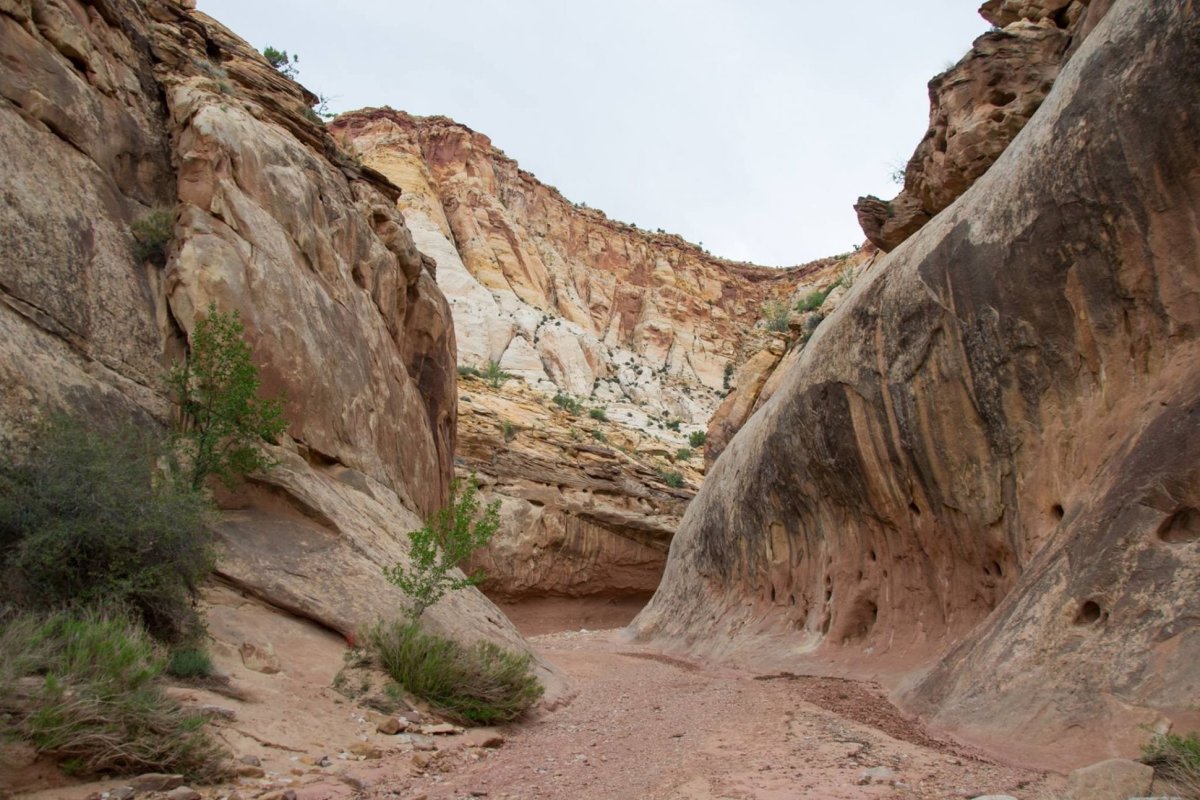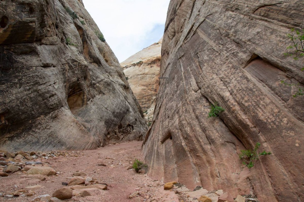 Další den máme na programu další národní park - Capitol Reef. Opět volíme tu nenáročnou variantu a autem projíždíme "Scenic Drive", na jejímž konci se ale už do soutěsky musí pěšky. Jdeme pár set metrů, pak to začíná vypadat na déšť, který ale nepřichází, přesto jdeme raději zpět. Na podobných místech jsou častá varování před "flash floods", tedy bleskovými povodněmi. Doporučuji zhlédnout pár videí na Youtube o tom, jak rychle může taková povodeň přijít. Jinak Capitol Reef je zase poměrně velký národní park, ve kterém by se dalo strávit o dost více času a zejména geologové by si tady přišli na své, ale musíme pokračovat dál...