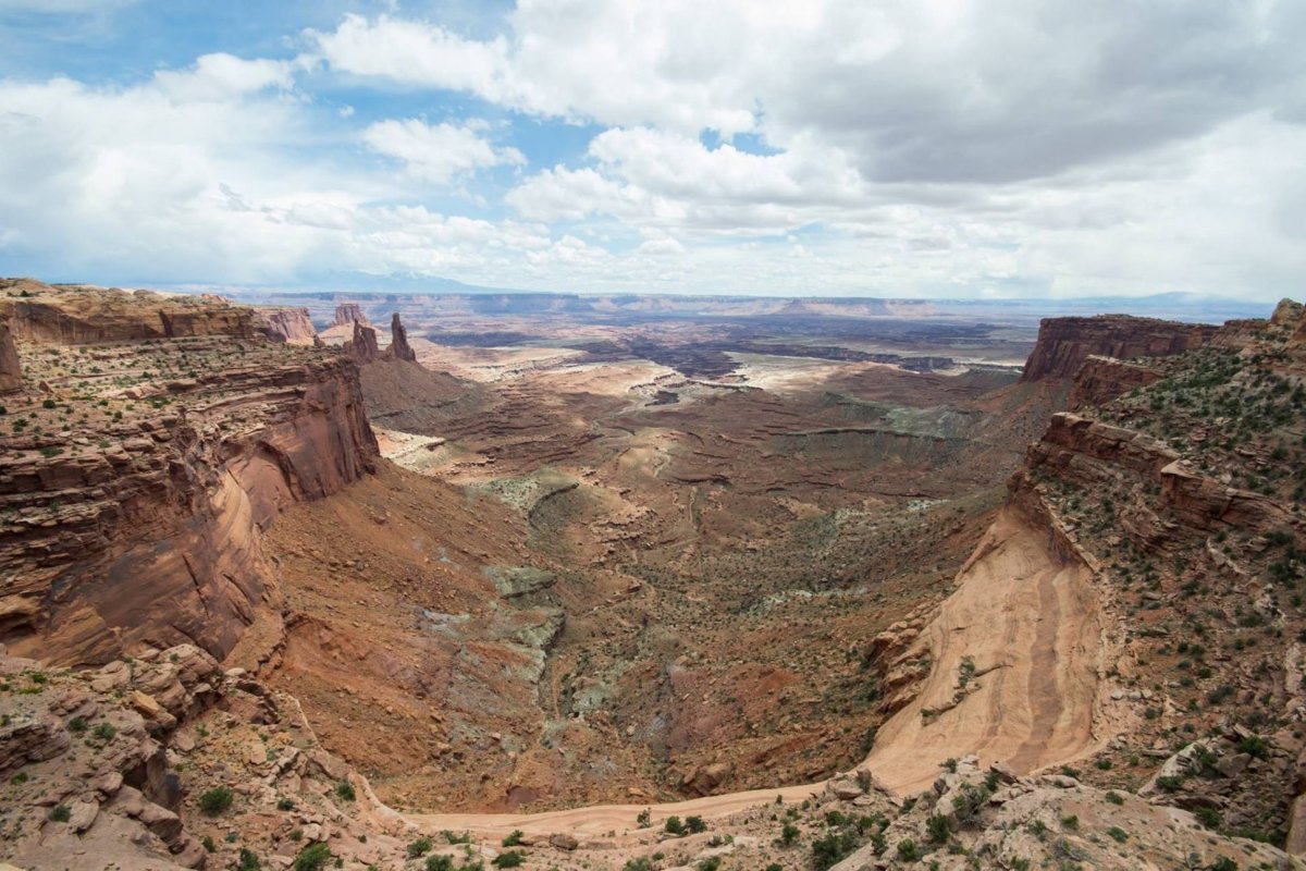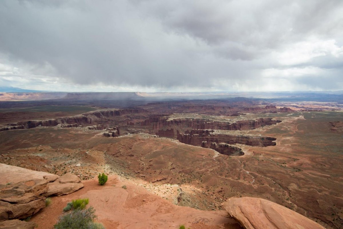 Už kolem poledne tedy přijíždíme do opět docela jiného světa. Zatímco v Arches bylo vše tak nějak zakulacené a vyhlazené, tak Canyonlands je spíš taková měsíční krajina, až na to, že vše má opět červený odstín. Tento park leží na soutoku Colorado River a Green River, tedy červené a zelené řeky a právě díky nim tady za posledních pár milionů let vznikla tahle drsná krajina. Nejznámější místem parku je oblouk (ano, opět oblouk) Mesa Arch, oblíbené místo zejména pro fotografy. Projíždíme park a zastavujeme na jednotlivých vyhlídkách, v dáli to vypadá na déšť, ale zdá se, že kapky ani nestihnou dopadnout na vyprahlou zem. Za mě určitě je Canyonlands velmi příjemné překvapení a určitě doporučuji. Zároveň tady musím opět zmínit film, tentokrát 127 hodin, který je ukázkou toho, jak se dá park prozkoumat i jinak než jen "pohledem shora" a je plný zajímavých a také nebezpečných míst.