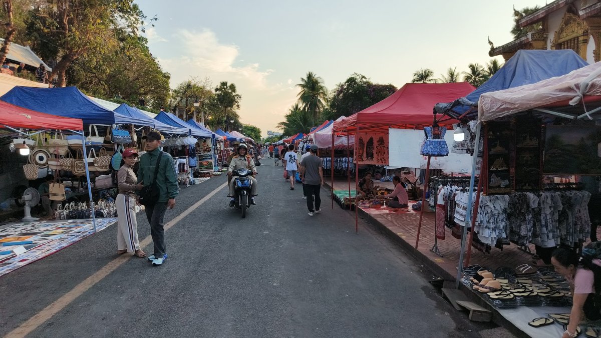 Po asi 40 km končí nejhorší úsek silnice, jakým jsem v životě projížděl a odbočuji na silnici vedoucí k druhému vodopádu. Vstupné už nevím, kolik stálo, nasednu do vozítka, a to mě s dalšími turisty odveze k bráně vodopádu. Podél stezky mají malý výběh medvědi, o pár metrů dále se v malých jezírkách čvachtali Číňani oblečeni v overalech i spoře oděné turistky z Velké Británie a zemí Beneluxu. Já využívám bazének k vyčištění svých cuklí, pokochám se chvíli pohledem na vodopád zespodu i z vrchu, inu, není to Iguazú. V areálu si koupím ještě kokos a jedu na ubytovnu. Zaparkuji skútr před vilou a ihned se ho ujímám vyčistit. Zpět do křišťálově čistého stavu mi trvalo asi hodinu, majitel vily pravil, ať se na to vyprdnu, že o vyčištění se postarají v půjčovně. Já ovšem nerad jezdím ve špinavém. Po tom všem si dopřeji chvilkový odpočinek, jednak jsem se při jízdě na skútru spálil, zejména stehna. Kolem 18:00 se vydávám prozkoumat ulice LP, centrem dění je dlouhá ulice s názvem Sisavangvong. Podél cesty místní prodávají ve stáncích různé ručně vyráběné předměty a cetky dovezené z Číny, mají je úhledně vyskládané na zemi. Nevím, kolik si prodejem mohou vydělat mimo sezónu, moc lidí ty věci nekupovalo. Na konci je tržiště, zde se prodávají jídla zejména asijské kuchyně, pečlivě jsem rozmýšlel, co si dám na večeři, načež usuzuji, že nejlepší bude nekupovat nic. Já na ty činské přejeté psy nejsem. Proto se odebírám do restaurace na břehu Mekongu, kde si objednávám jen misku rýže.