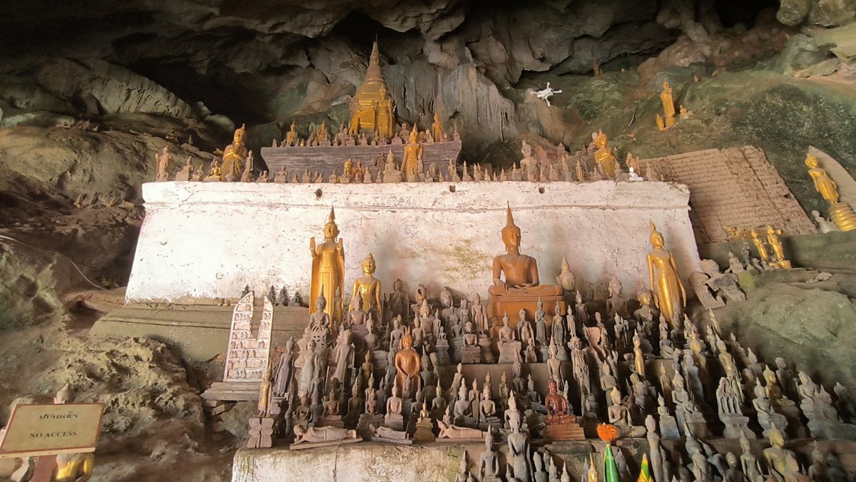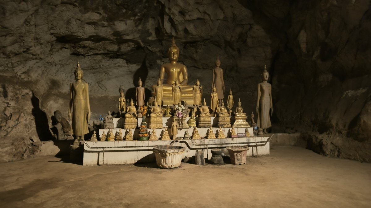 K jeskyni se dostanete loďkou přes Mekong, cena lístku je 30 000 kipů za oba směry. Ještě, než se nalodím na tradiční dřevěnou loďku, oslavuji malé vítězství, jedna paní zde za 70 000 kipů prodává ručně tkané šátky, které bohatě zakryjí mé stehna i část holení. Hned kupuji jeden a spolu s toaleťákem nesmí chybět ve výbavě na každém výletu. Jsme na druhém břehu řeky, kupujeme si lístek do jeskyně za 20 000 kipů. V jeskyni se nachází sošky Budhy, šikmáči zde prováděli rituály, moc jim nerozumím, budhismus mě nezajímá, prostě juknu 2 sekundy na sošku a jdu dál. O pár desítek metrů je další jeskyně, větší, taky jsou tu sošky Budhy, ale kromě toho také plno odpadků. Nahoře načerpám síly a po pár minutách scházím k přívozu. Jedu zpět na břeh a vracím se do LP. V polovině cesty zastavuji na pozdní oběd, podává se kokos. Večer jdu opět na trhy, na večeři si dávám první pouliční jídlo ze stánku, 3 špejle s masem a pivo Beerlao. Je to řádný kentus to pivo, horší močku jsem v životě nepil.