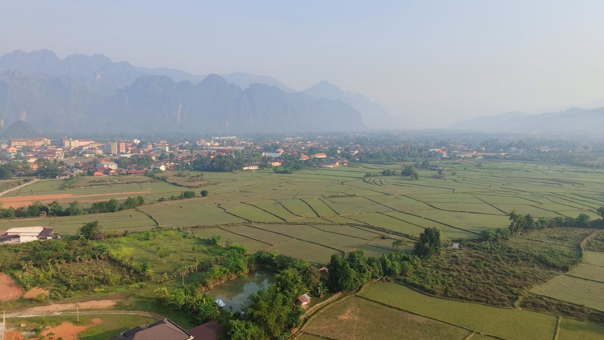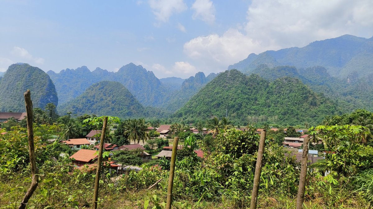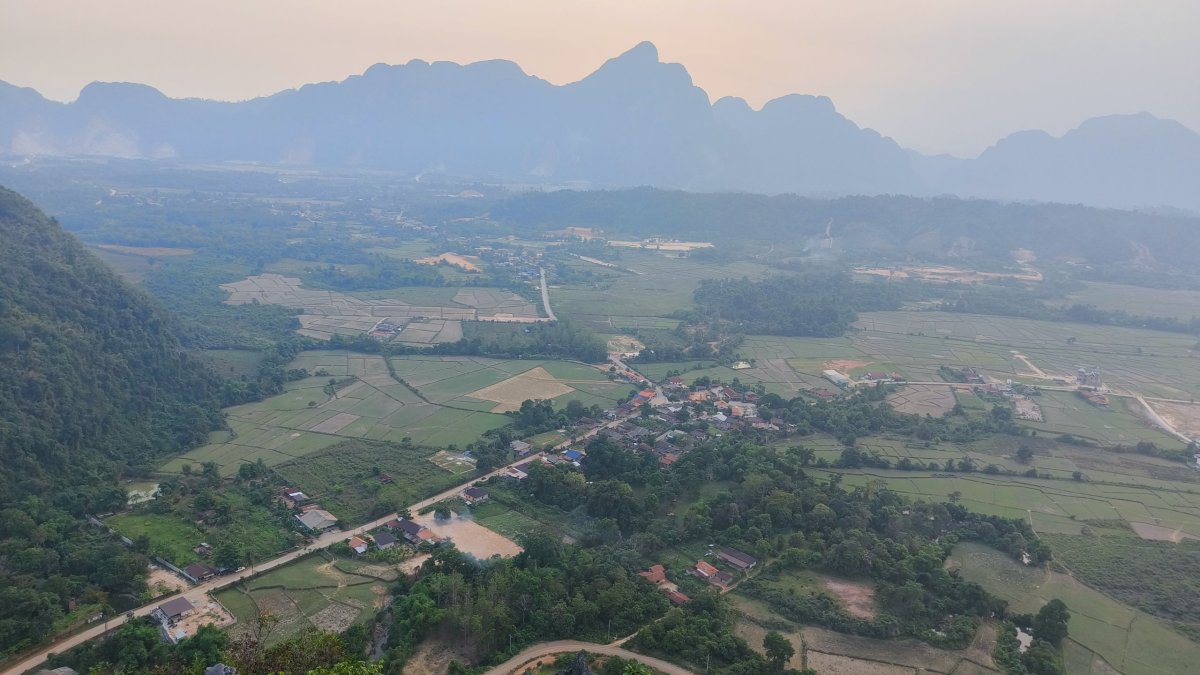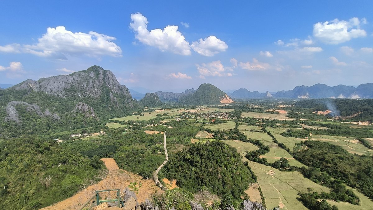 Mou první zastávkou byla vyhlídka Nam Xay, vstupné činilo asi 30 000 kipů. Výšlap mi trval asi 30 minut, stezka není moc dobře upravena. Hlavní atrakcí na této vyhlídce je motorka s laoskou vlajkou. Na další vyhlídce je letadlo a okřídlený kůň, tam jsem ale nebyl. No, výhledy na okolní skály a zeleň byly opravdu monumentální, v dáli stoupal dým z vypalující vegetace. Po asi hodině slezu dolů a jedu se zchladit do jedné z pěti lagun, které jsou po okolí rozeseté. K laguně č. 3 přijíždím po půl hodině jízdy, vstupné činí asi 20 000 kipů. Vodním radovánkám se opět oddávají navlečení rákosníci a pár turistů z VB. Kdo si chce zablbnout, k dispozici je jakýsi vlek. Na zpáteční cestě se zastavuji do místního pohostinství povečeřet, samozřejmě nesmí chybět kokos. Cestou na hotel pozoruji, jak žijí vesničané, ještě teďka cítím ten hnusný zápach kouře, jak pálí na okraji cesty odpadky.