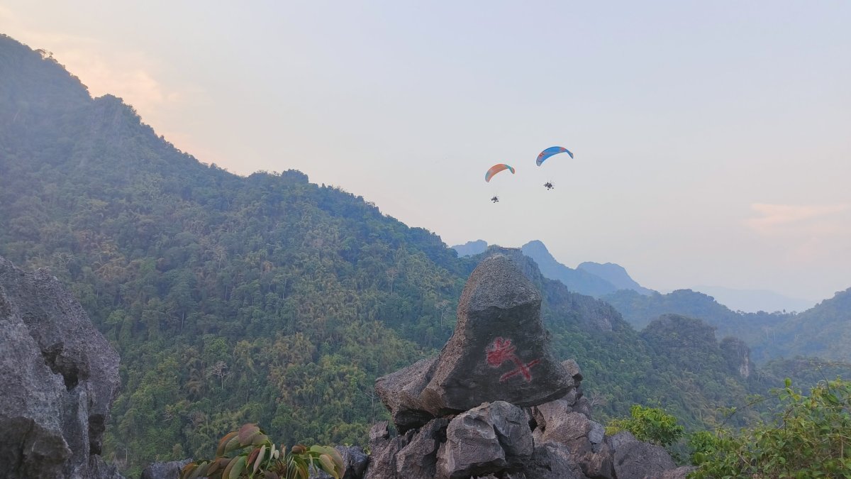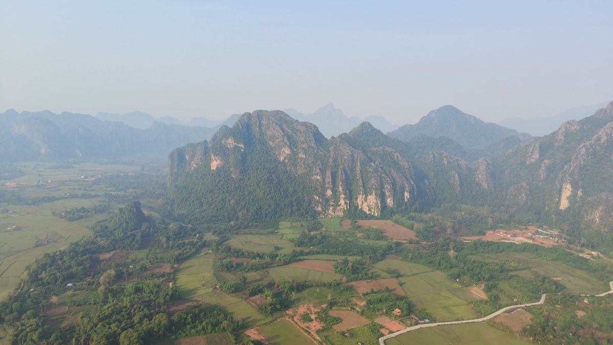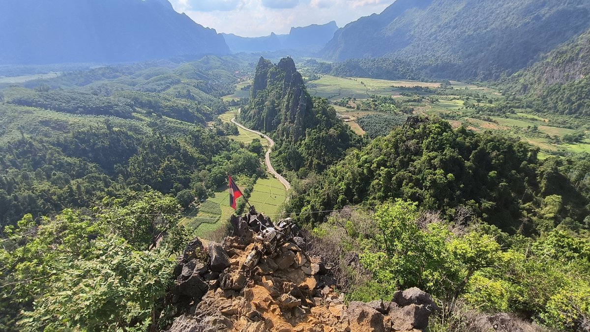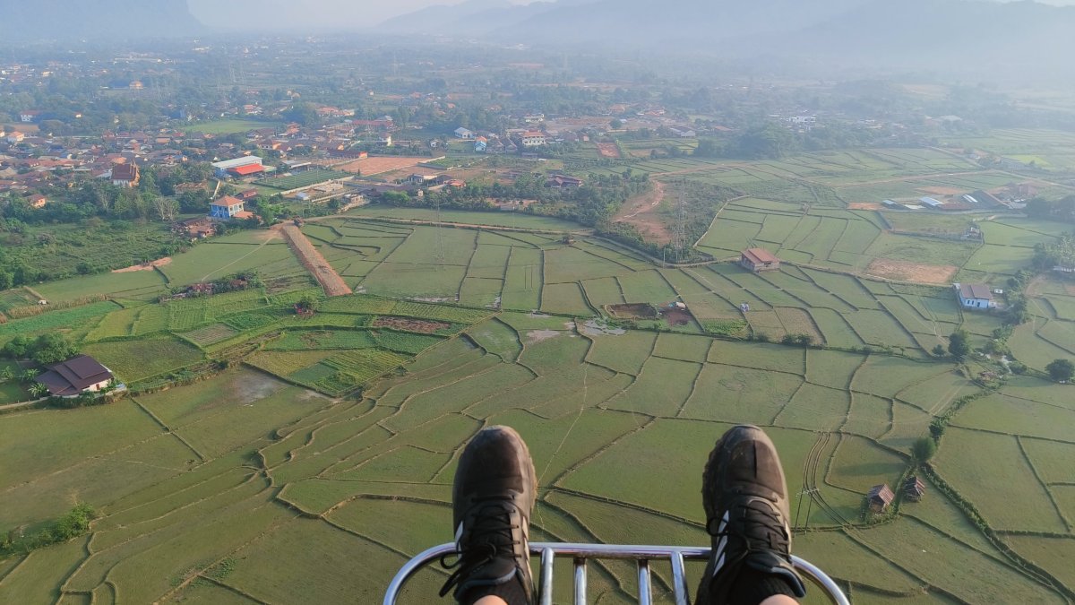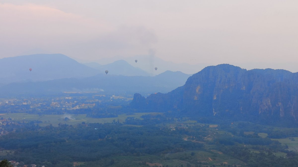 Čas pokročil, je ideální chvíle vyšlapat na další vyhlídku. Výběr padl na Silver Cliff kousek od vesničky Phone Ngeun. Přístupová cesta je trochu schovaná, ale při troše pozornosti ji neminete. Vstupné asi 10 000 kipů. Cestou nahoru potkávám vracející se skupinku britských turistů, jinak nikde ani noha. Kousek pod vrcholem je třeba dávat pozor na ostré skály, přeřízl jsem si takhle botasky na nártu. Nahoře jsou 2 vyhlídkové platformy, odkud můžete pozorovat balony, paramatory a zamávat jim.