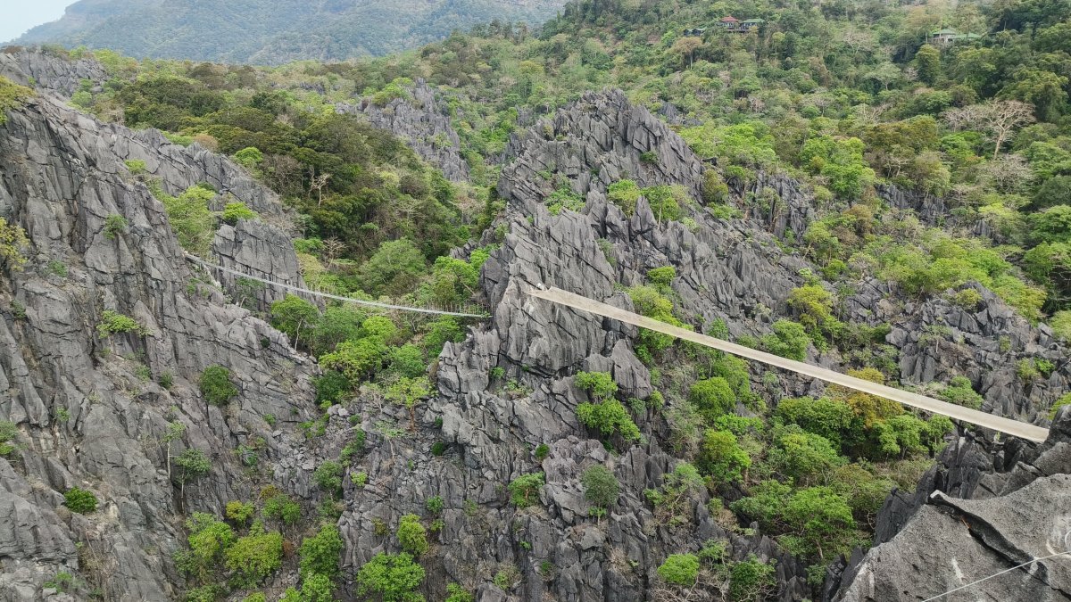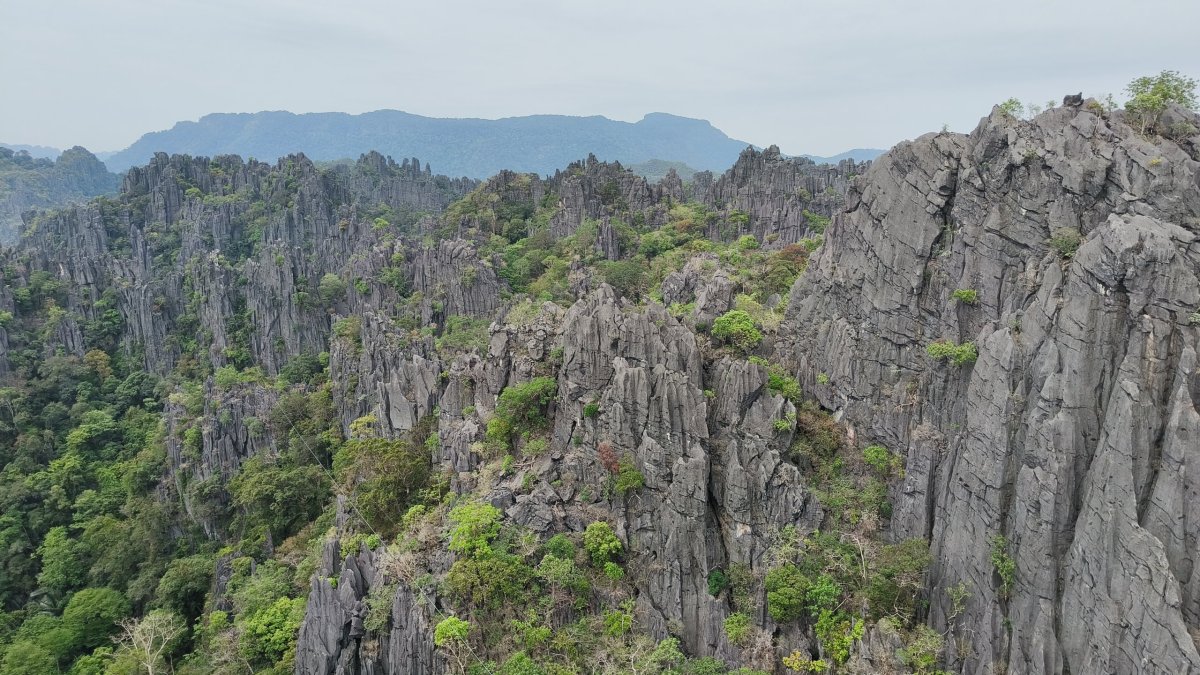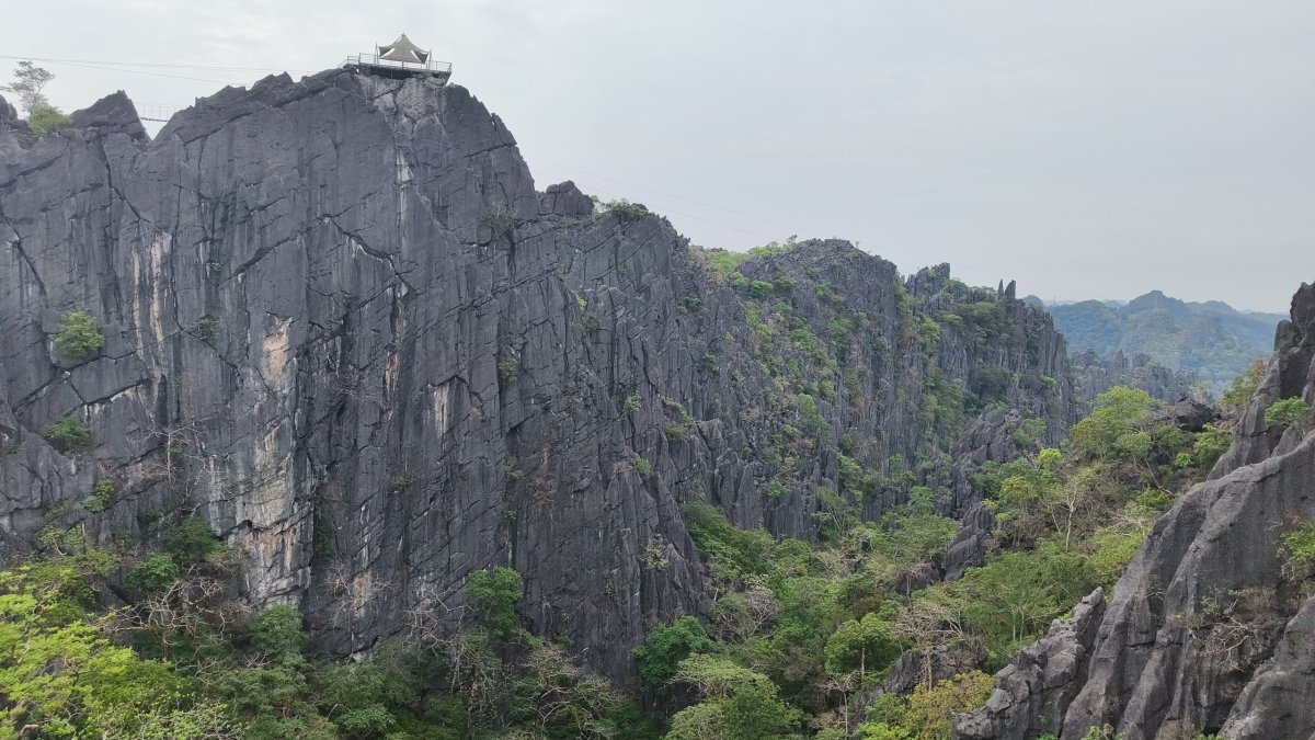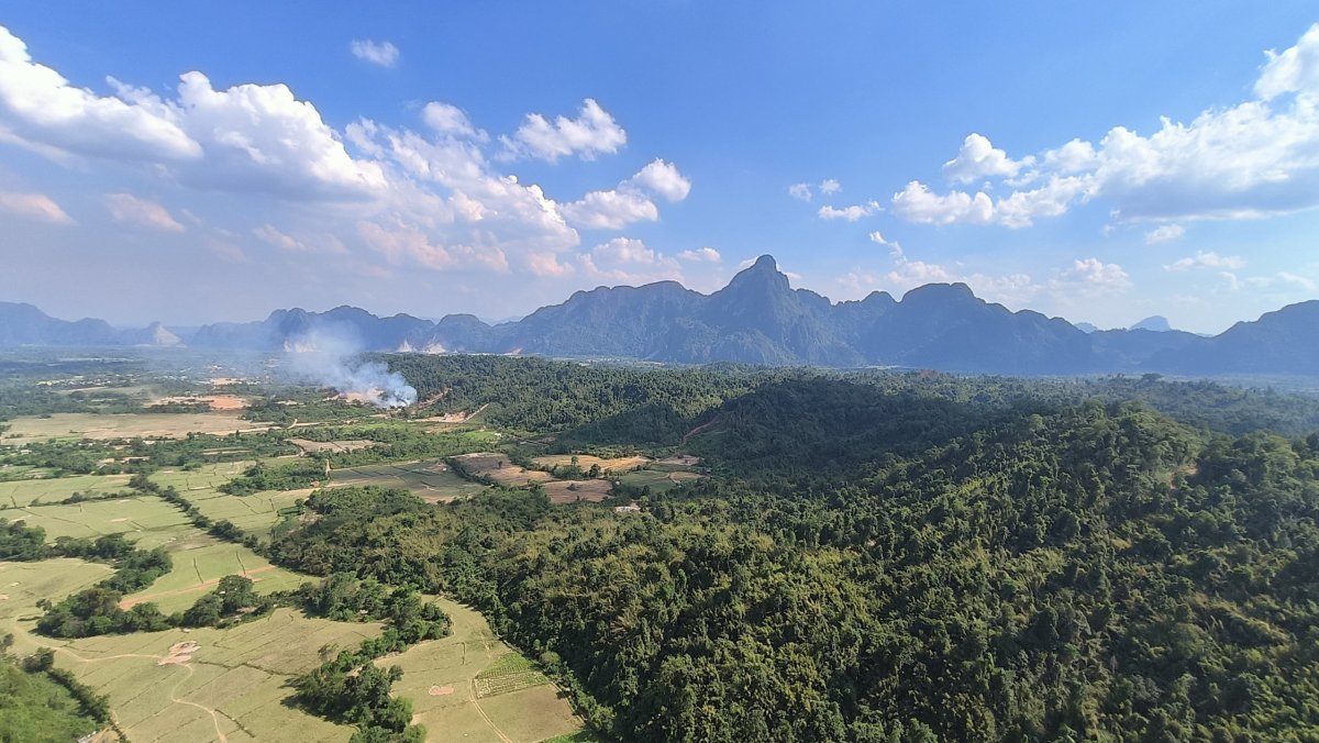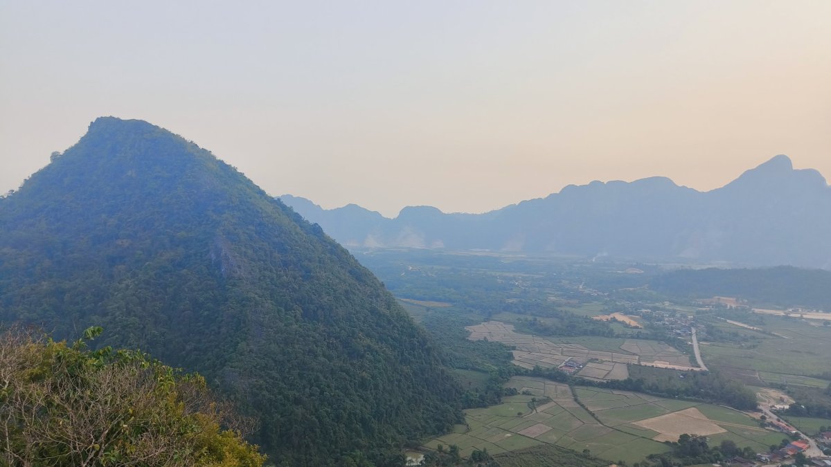 Čas pokročil, je ideální chvíle vyšlapat na další vyhlídku. Výběr padl na Silver Cliff kousek od vesničky Phone Ngeun. Přístupová cesta je trochu schovaná, ale při troše pozornosti ji neminete. Vstupné asi 10 000 kipů. Cestou nahoru potkávám vracející se skupinku britských turistů, jinak nikde ani noha. Kousek pod vrcholem je třeba dávat pozor na ostré skály, přeřízl jsem si takhle botasky na nártu. Nahoře jsou 2 vyhlídkové platformy, odkud můžete pozorovat balony, paramatory a zamávat jim.