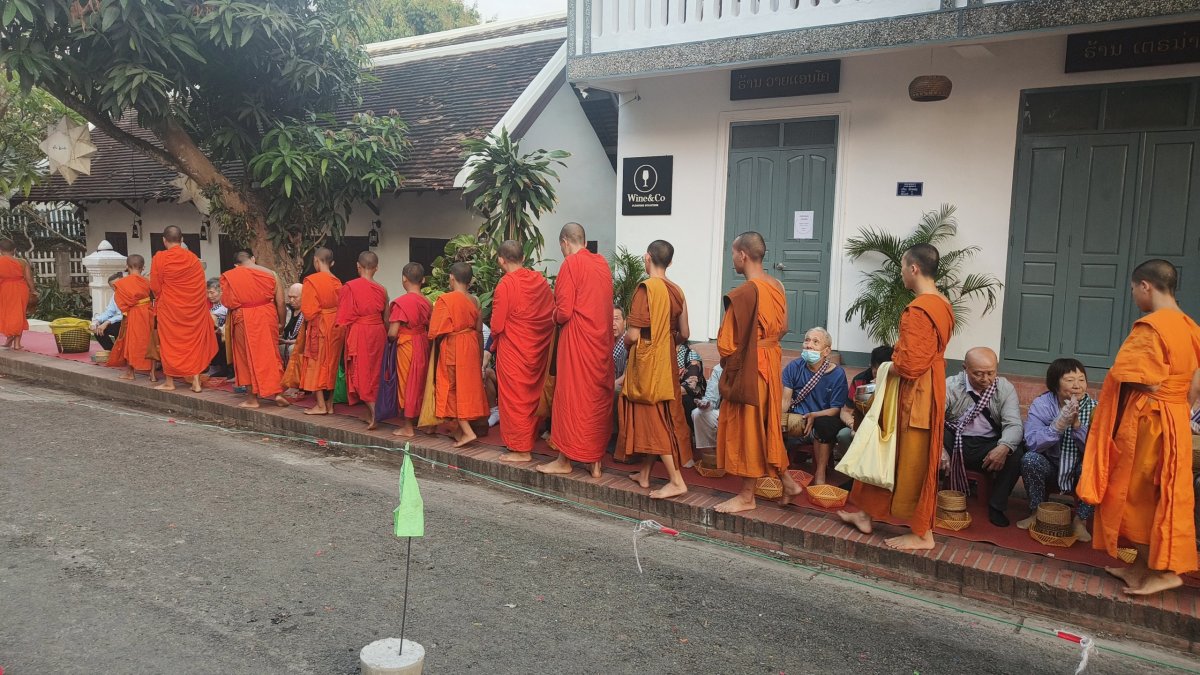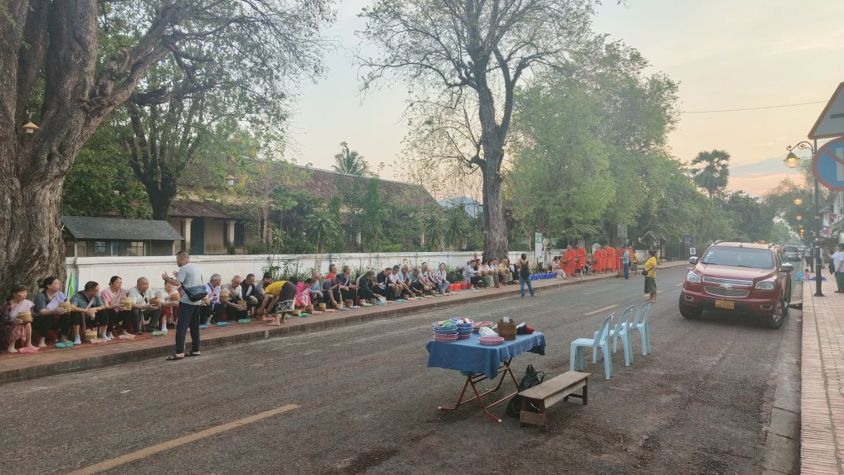 Ráno vstávám kolem 5:00 abych se podíval, jak probíhá v ulicích LP ranní rituál mnichů, tedy žebračina o almužnu. Kolem cesty místní vyskládají několik stovek židliček, na které posadí turisty, aby předali buď hrstku rýže nebo čehosi jiného mnichovi a ten si to hodí do pytle. Mnichové vycházejí z kláštera před 6:00 a chodí bosí. Ten proviant prodávají místní za 50 000 kipů a snaží se to vecpat opravdu každému turistovi. Já bohužel neměl u sebe peníze, tudíž asi 30x odmítám. Darovači byli vesměs ČíňanI a pár Evropanů, no dalo by se říct, že byla obsazena asi čtvrtina židliček. Po tomto ranním rituálu odcházím na snídani, v 8:30 přijede pro mě dodávka, aby mě odvezla na nádraží. O jízdenku už nemusím žádat v okénku, zajistil mi ji majitel ubytka a poslal na mobil.