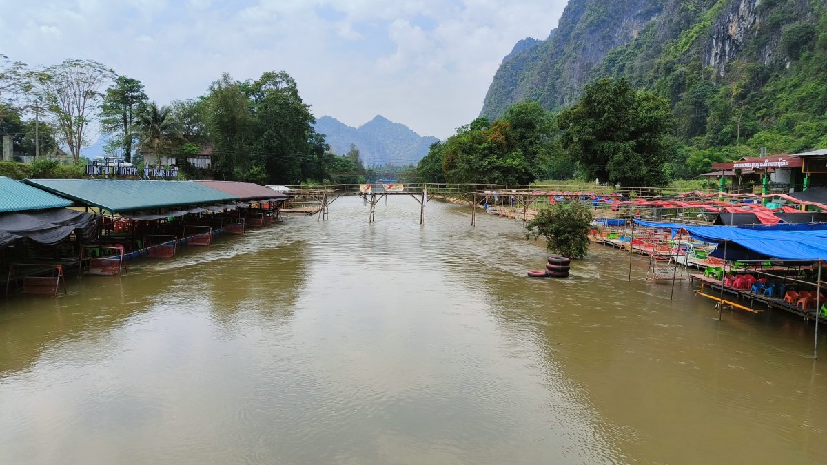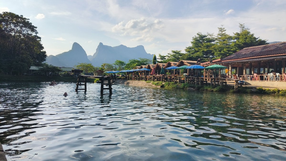 O to víc si přítomnost u této laguny vychutnávám, mám ji zcela pro sebe, jedinou kaňkou je spadlé listí na hladině. Po asi hodině přijíždějí 2 turisté. Pak se jedu podívat do jedné vesnice, jak skromně žijí zdejší obyvatelé. Skútr dostal pořádnou nálož bláta, proto si ho jedu na břeh řeky Nam Song umýt. Hned u břehu je opuštěná restaurace Organic Farm restaurant, prodávají tam vynikající morušový džus a další pochoutky. Dalším bodem na mapě je Modrý most, vstup činí 20 000, je tu ještě jeskyně za 40 000 a ziplajnové a kajakové aktivity za statisíce. Neobtěžuji se zde byť 10 min setrvat, nasedám na skútr a jedu dál. Slunce pomalu zapadá, nastává ideální chvíle se posadit na louku a pozorovat startující paramotory a vznášející se balóny. Pak už jen véča a spát.