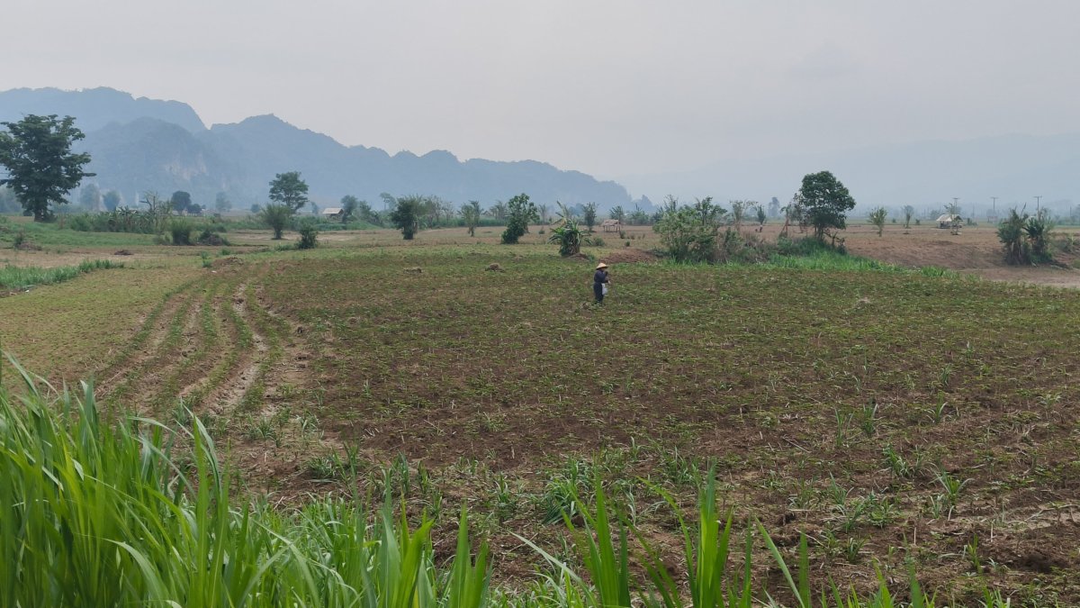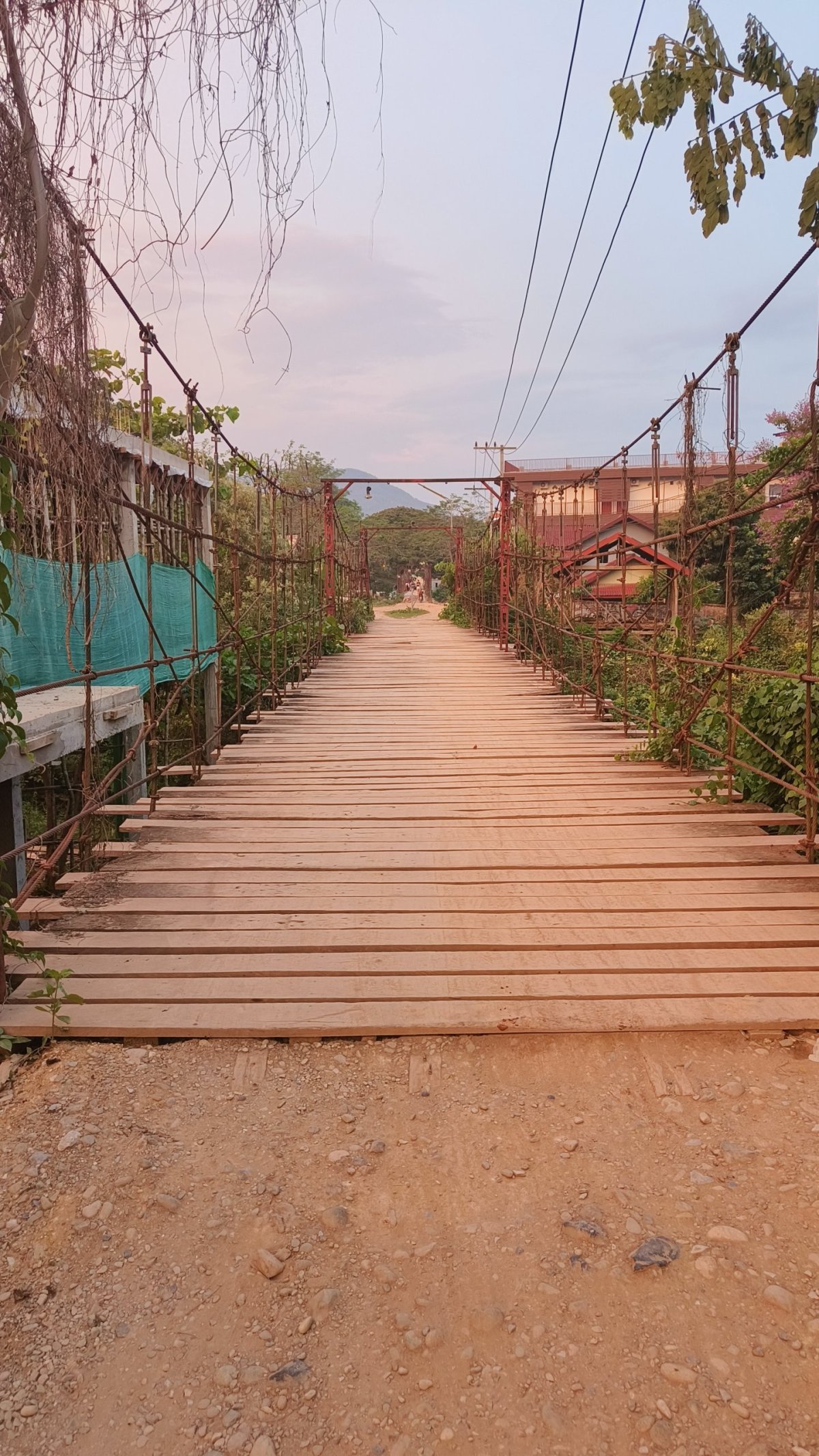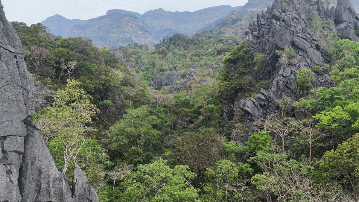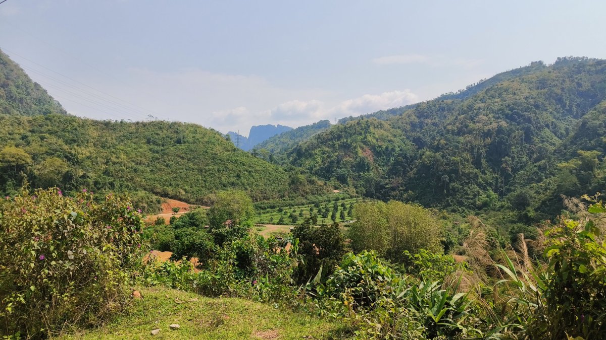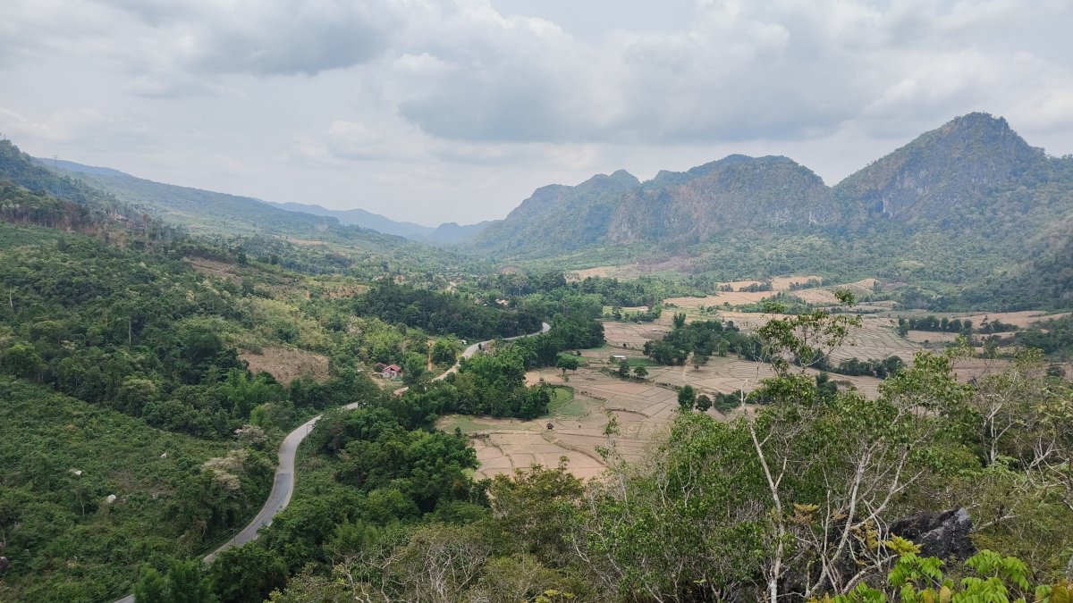Z vyhlídkové platformy je výhled na okolní kopce. Moc se nahoře nezdržuji, mouchy nade mnou krouží jak nad mrtvolou. Cesta dolů zabere 15 minut, jako pozornost při odchodu dostanete zdarma láhev vody. Cesta mě opět zavede do hor, asfalt se mění v prach a kamiony opět hrajou na honičku. Přes zvířený prach nejde vidět na 5 metrů, všude je cítit, jak kamionům se vaří brzdy, když na poslední chvíli brzdí z kopečka před ostrým esíčkem. Každou chvílí čekám, jestli někdo zahučí do propasti. Asi jiný gang, všichni bezpečně dorazili do doliny. Ocitám se ve vesničce Na Hin, ubytovna Sanhak Guesthouse and Restaurant se stane mým domovem na dvě noci. Je to tu samý Číňan. Platí se zde hotově po příjezdu, naštěstí tu mají 2 bankomaty, jsem už na suchu. Pak se projdu po vesnici, je tu jedna ulice, kde jsou namačkány všechny krámy, reštiky a trh.