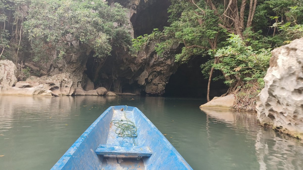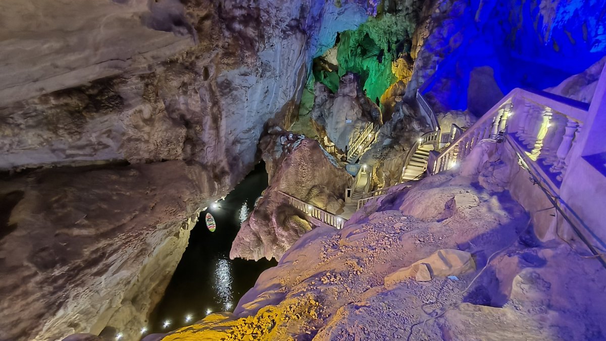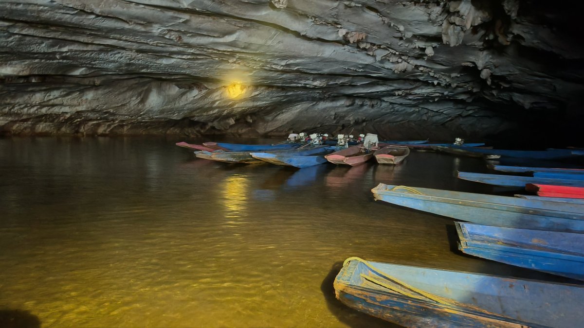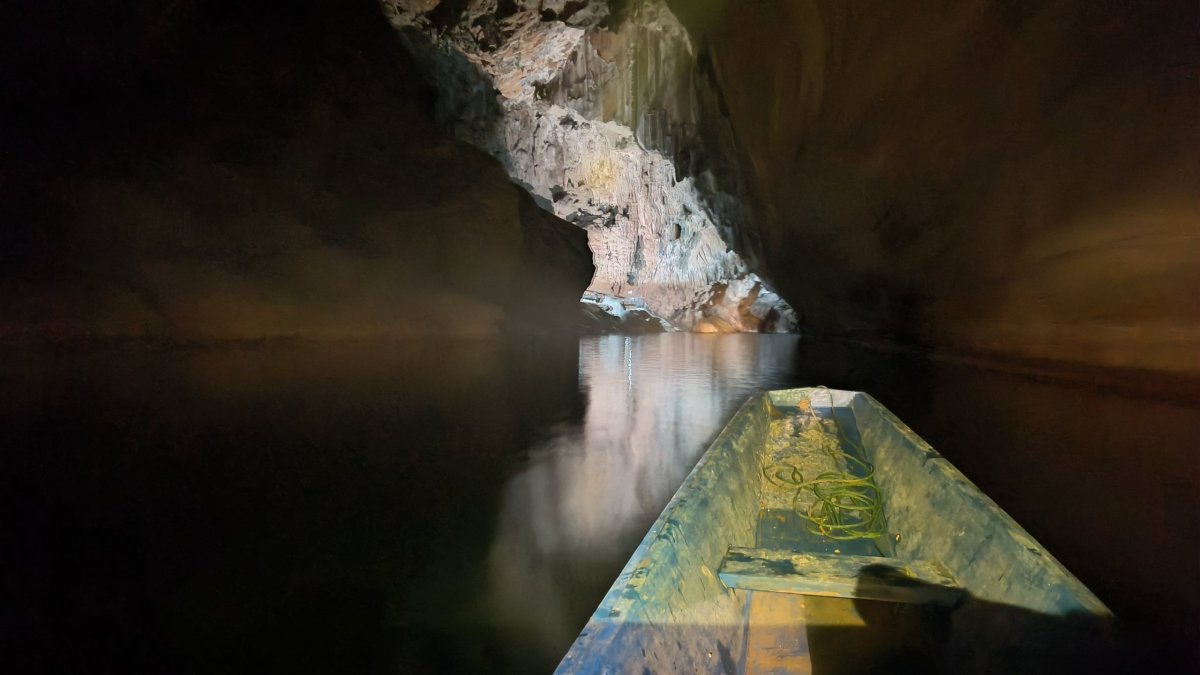 Po asi 40 minutách dojedeme na místo, kde to jinudy nejde, proto se domnívám, že loďku tu zaparkujeme a my musíme do osady po svých. Nepřišlo mi divné, že je furt tma. Po asi 200 metrech, kdy už vidím světlo na konci tunelu začíná přibývat vody a já nevím kudy dál. Najednou slyším kravál, otočím se a jdu zpět. Lodník na mě volal, že tohle není konec cesty, musíme jet dál loďkou, ale potřebuje pomoct ji vysmyčit. Proč to neřekl dříve, nikam bych neodcházel :-D Asi 30x jsem se mu omluvil a chopil se lana, abych mu pomohl vysmýčit tu loďku. Ti další 2 nepomáhali, byla to starší žena se svým asi 5letým vnukem. Loďku se nedařilo vytáhnout, potřebovali jsme překonat asi půlmetrový rozdíl hladin. Proto jsme se rozhodli nasbírat metr dlouhé klacky a podložit loďku, s tím že ji budeme po nich šibovat. To taky nepomohlo. Nakonec se rozhodl lodník i za cenu rozbití lodního šroubu tento schod překonat svižnější jízdou. Párkrát se odrazil od skal, div neudělal díru do trupu, ale kupodivu se mu to podařilo. Nastoupili jsme zpátky do loďky a jeli dál. Dorazili jsme k místu vylodění, schylovalo se k bouřce, proto lodník se mi rozhodl dát jen 15 minut na průzkum. Nic moc tu není, pár chatrčí, nějaké restaurace, a to je všechno. Někteří turisté převážejí na loďkách kola či skútry, odtud se dá jet někam dál, to ovšem nebyl můj případ. Zpátky už jedu jen já a lodník, cesta trvá o několik minut méně, cestou potkáváme další loďky, proto musíme jet krokem, abychom se nesrazili. Úspěšně jsme dorazili na začátek, odevzdávám čelovku a vestu, a jedu na ubytovnu. Večer se koná v „hotelové“ restauraci vesnická zábava.