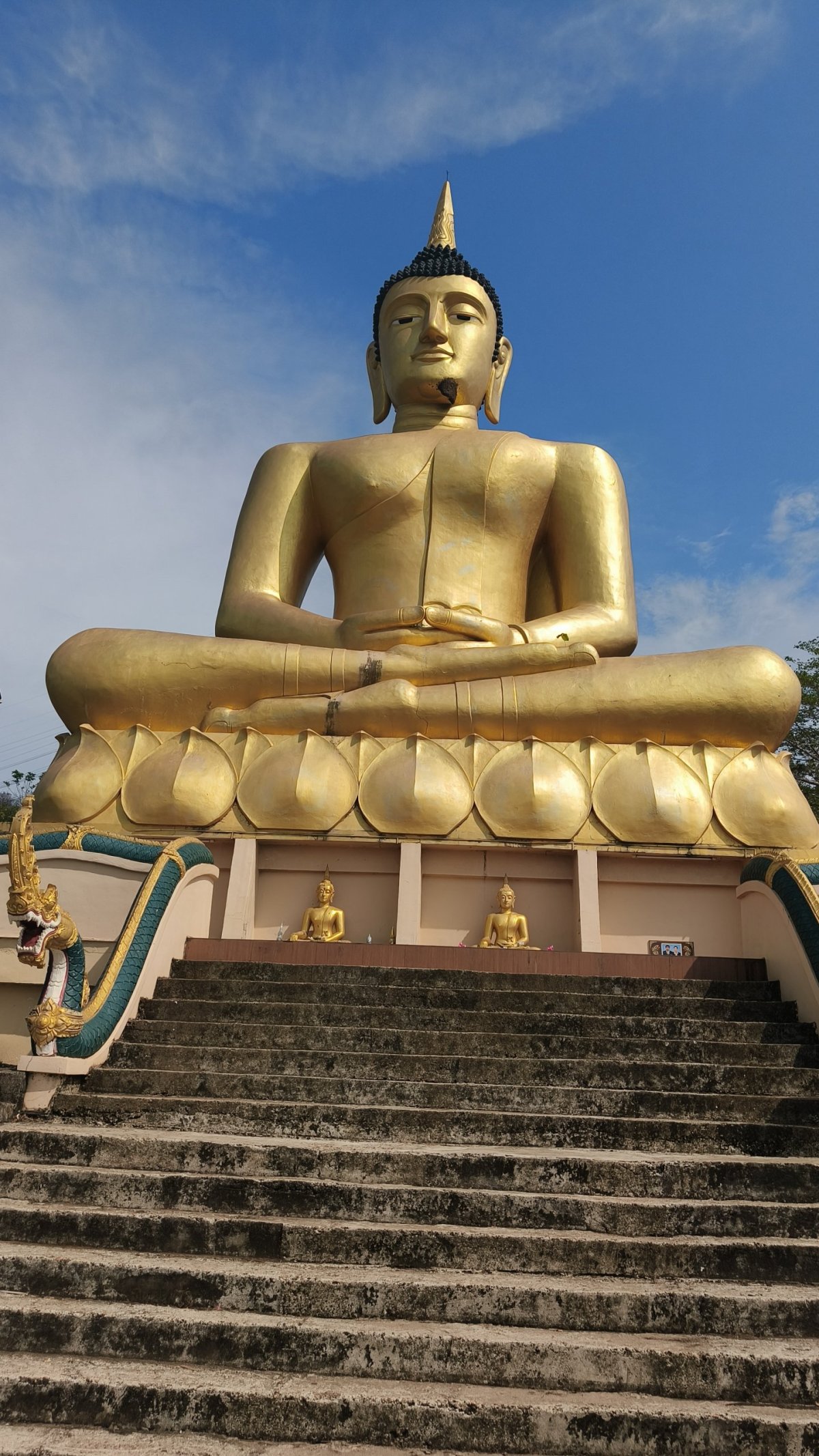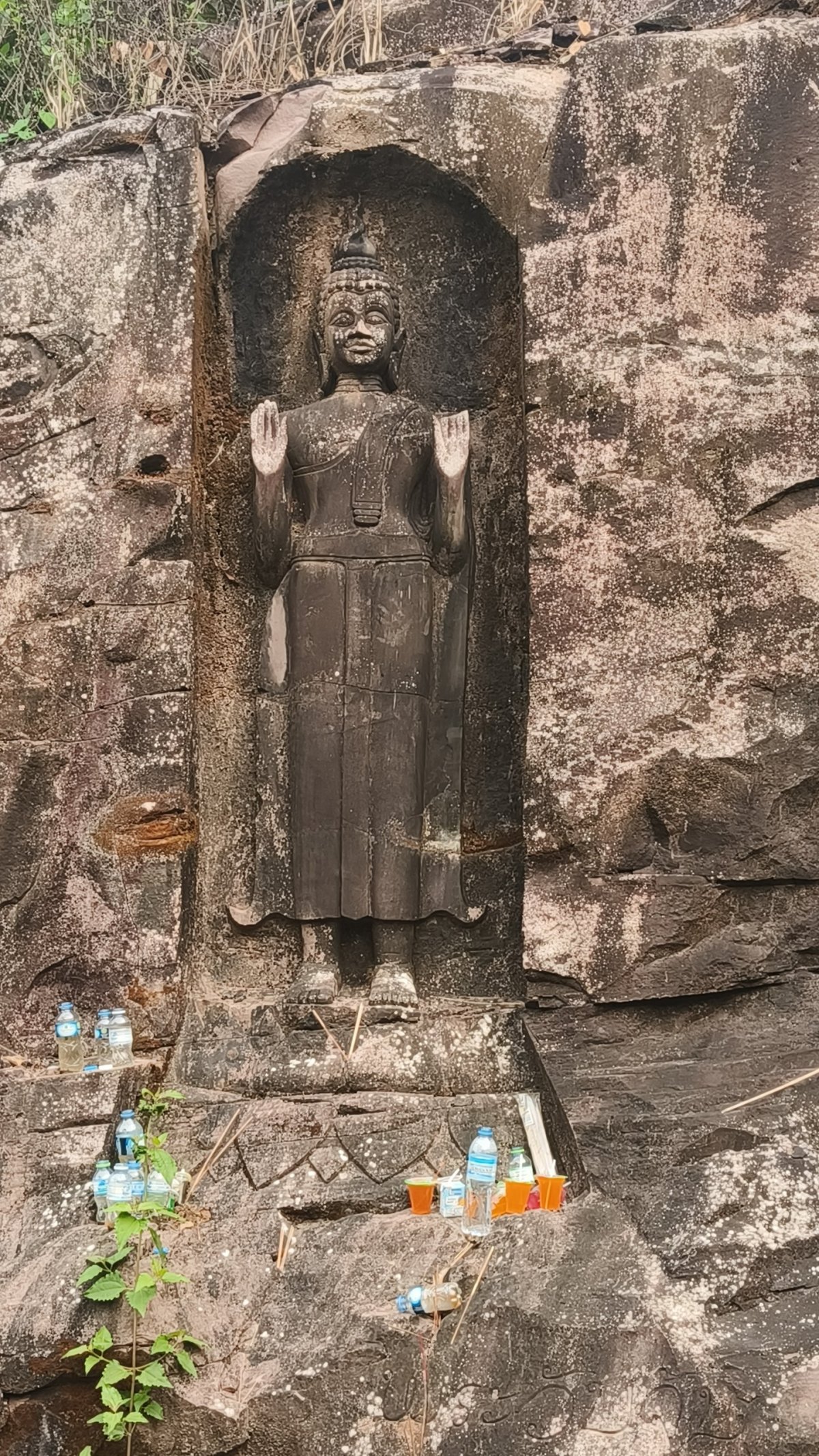 Je tady druhý den na okruhu Thakhek, po asi 20 minutách jízdy narazím na několikakilometrový úsek silnice zavalený balvany, stromy a hlínou způsobený sesuvem půdy před 2 lety. Opět obdivuji tento přírodní úkaz dlouhé minuty. Za dalších pár km narazím na pískovcové sochy Budhy vytesané ve skalách. U každé sochy je položena nějaká věc, většinou láhev s vodou a nějaké vonné tyčinky.