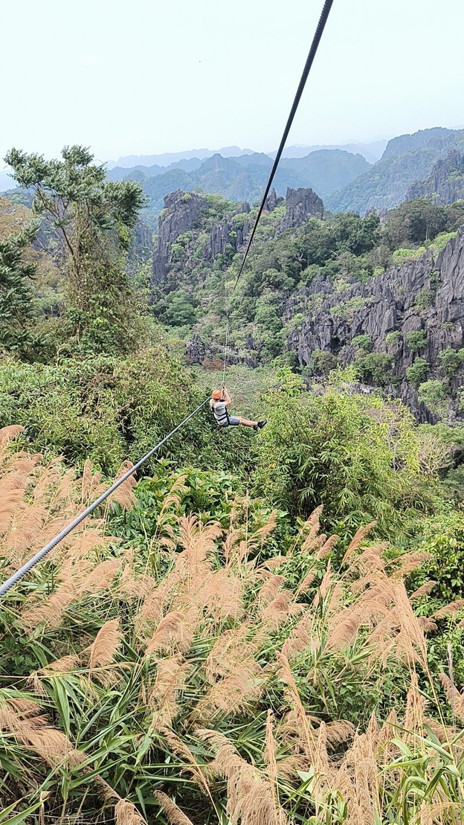 Na 8:30 mám objednanou Zipline u Rock Viewpoint. Za 2 hodiny zábavy platím 30 USD, společnost mi bude dělat švýcarsko-francouzský páreček. Podstupujeme úvodní školení, co a jak máme dělat, jak se držet, jak přepínat karabiny atd. Přistupujeme na nástupní platformu, jeden instruktor nás bude jistit zepředu pro případ, kdybychom zůstali viset daleko od výstupní platformy, aby nám pomohl se přitáhnout. Proto sklouzává jako první. Pak jde na řadu žena, poté její partner a na konec já. Za mnou ještě je druhý průvodce, který to jistí zezadu a pořizuje fotky či videa na památku. První ziplajna měřila 480 m a vinula se vysoko nad propastí. Zážitek to byl vskutku monumentální. Pak jsou 2 kratší ziplajny, 90 respektive 70metrová. Následuje dřevěný mostek a pavoučí síť, to vše nad propastí. Vylezeme na vyhlídkovou plošinu a užíváme si 360° výhled na okolí, pozorujeme opice. Pokračujeme k další ziplajně, tentokrát o délce 320 m. Poté jdeme džunglí asi 600 m, než narazíme na poslední stanoviště, kde je začátek 280 m úseku po němž sjedeme zpátky na začátek. To vše trvalo asi 85 minut, 2 hodiny je ojeb. Ale když to porovnám se Ziplajnou na Maui, kde to stálo přes 100 USD, tak těch 100 USD bych raději zaplatil tady a stejně dostanu víc. K dispozici je kromě 2 hod balíčku půldenní za 120 USD/osoba nebo 60 USD/osoba, pokud jste aspoň 2 a celodenní 180 USD/osoba nebo 90 USD/osoba, pokud jste aspoň 2. Celkově tak nejlevnější balíček nabízel 1230 m sjezdu, prostřední balíček 3360 m sjezdu a nejdražší 4200 m sjezdu + další aktivity jako kánoe, vstup do jeskyně aj. Rozloučím se s personálem a nasedám na skútr dokončit Thakhek okruh. Ve městě Thakhek jsem popoledni, odevzdám skútr a jdu se ubytovat. Cestou jsem narazil konečně na poštu, posílám pohledy do ČR, které jsem v batohu už týden pučil. V době vydání cestopisu ještě nepřišly 😊 K večeru jdu do města na večeři.