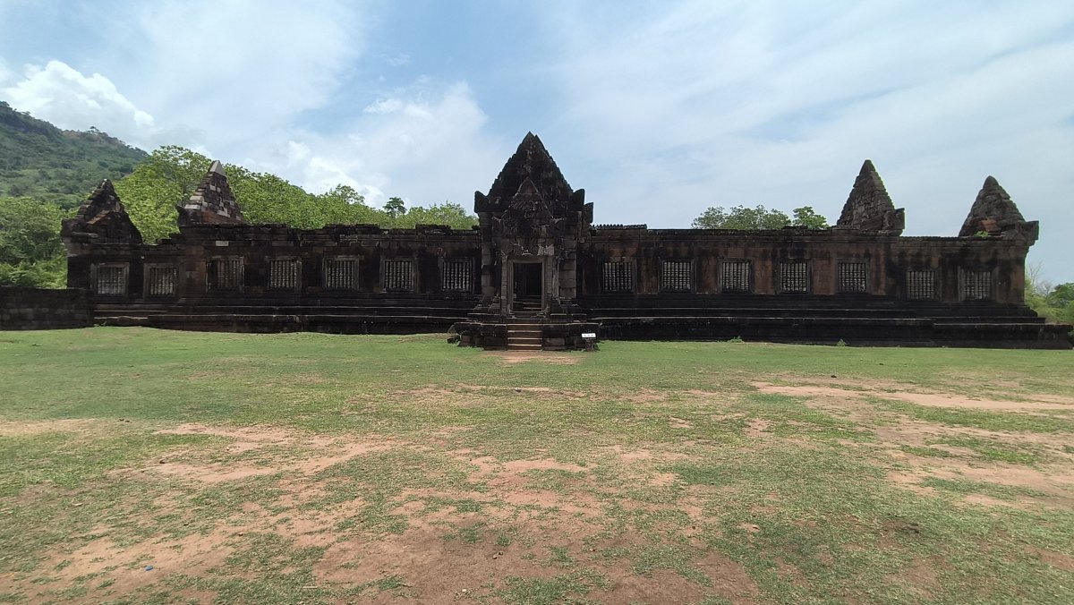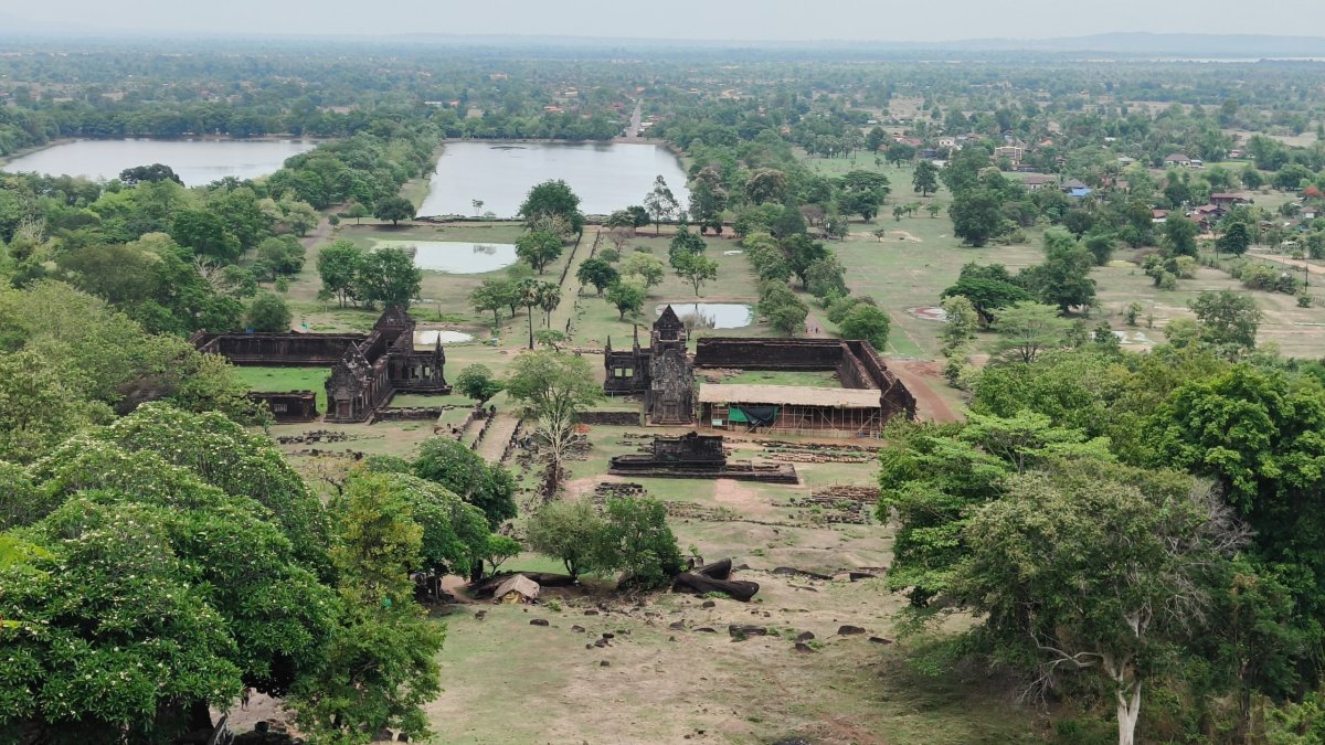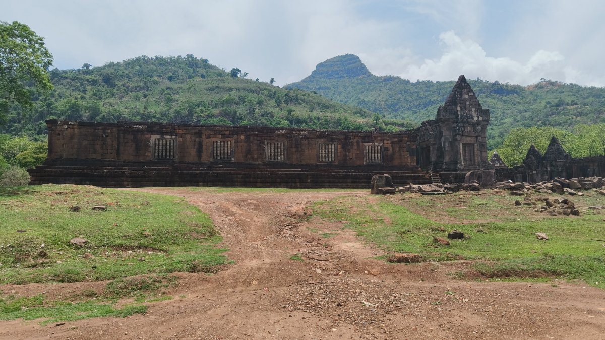 V 8:00 vyrážím na poslední 85 km úsek malého okruhu. O dvě hodiny později parkuji před Heaven guesthouse, povídám mužatce, že si tady nechám věci a jedu do Angorwatu, teda do Vat Phou. Kolik stálo vstupné už nepamatuji, moc to nebylo, po koupi lístku nasedám na vozík a šofér mě veze na nějaké parkoviště či co. Tam mě vysadí a potom jdu asi 5 minut k ruinám. Jsou tu 2 ruiny do obdélníku a pak strmé schody k sochám. Odtud je hezký výhled dolů. Trochu se pokochám výhledy a jdu zpět. Na parkovišti čeká na mě vozítko, a to mě odveze zpět k vrátnici. Cestou zpátky se zastavuji na Wat Phousalao odkud je výhled na město Pakse.