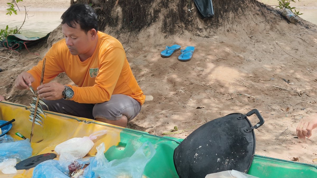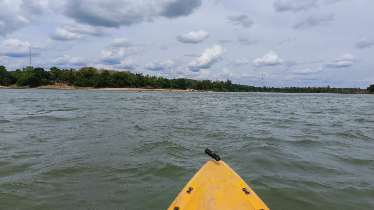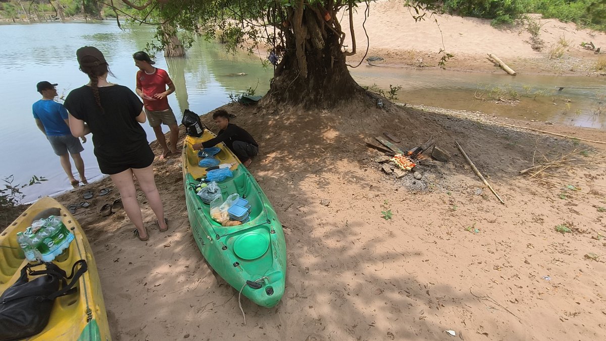 Dnešní den se ponese ve sportovním duchu. Kromě jízdy na kole je tady hlavní lákadlo jízda na kajaku. Za 400 000 kipů 8hodinový program včetně snídaně a obědu. V 8:00 mě majitel hotelu odveze do restaurace na snídani, zde se setkávám s dalšími 2 páry, francouzsko-thajským a belgickým. Po snídani fasujeme záchranné vesty a nepromokavé pytle na uchování vody a cenností. Jelikož jsem sám a kajaky jsou dvou osobové, mým parťákem je instruktor. První etapa trvá asi půl hodiny, během ní stříkáme na sebe vodu, děláme závody nebo ze srandy otáčíme pádly cizí kajak (vzhůru nohama ne !!!). Vylodíme se na břehu, jeden instruktor jde s námi na pěší túru, druhý instroktor hlídá vybavení na břehu. Během túry dojdeme k nějakému vodopádku a tam se ochlazujeme, po nějaké chvíli pokračujeme v túře a dojdeme na jinou pláž, než jsme si původně vystoupili, kde už na nás čeká druhý instruktor. Je čas oběda, z krabiček vyndávají sardinky a nějaké maso se zeleninou, bude se podávat ražniči. Zatímco my odpočíváme pod stromem, instruktoři rozdělávají oheň a připravují pokrm. Jako dezert se podává mango. Po obědě opět nasedáme na kajaky, čeká nás nejdelší a nejdivočejší pasáž. Z poklidné říčky se dostáváme do místa, kde se řeka dramaticky rozvětvuje a rozbíjí o balvany do mnoha ramen a kanálů. Voda zde hučí, víří a láme se v pěnových vlnách, jak si razí cestu přes nepravidelné skalní útvary. Tu a tam nás ošplouchne menší či větší vlna, ale naše kajaky odolávají, zní to dramaticky, ale i kajakář začátečník to přežije bez úhony, pokud bude následovat pokyny instruktora. Celí mokří vystoupíme na břehu, 50 m dál po proudu už je Kambodža. Naložíme kajaky na nákladní ťuk ťuk a vracíme se do Nakasongu. Cestou se ještě zastavíme u vodopádu KhonePhapheng, vstupné bylo v ceně balíčku. Tyto vodopády mají největší průtok vody ze všech vodopádů na světě. V Nakasongu opět nasedáme do kajaku a pádlujeme zpátky na Don Det.