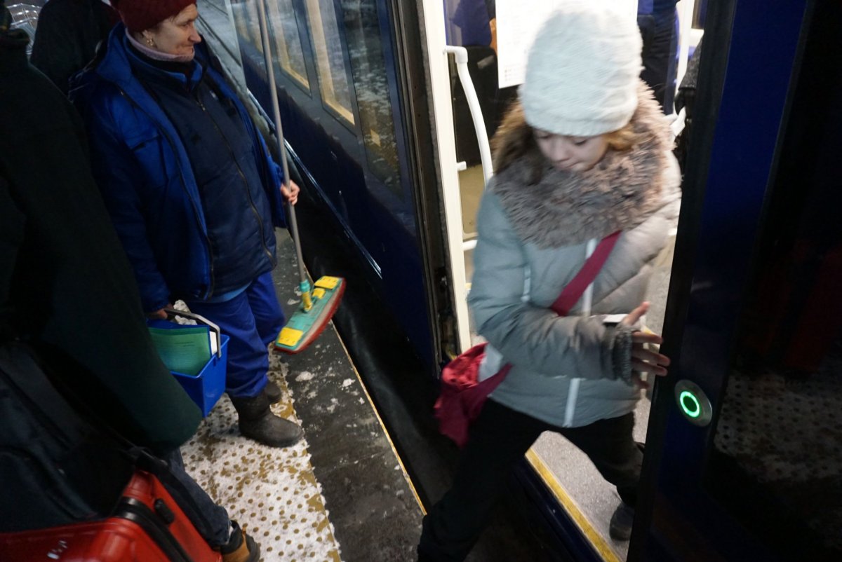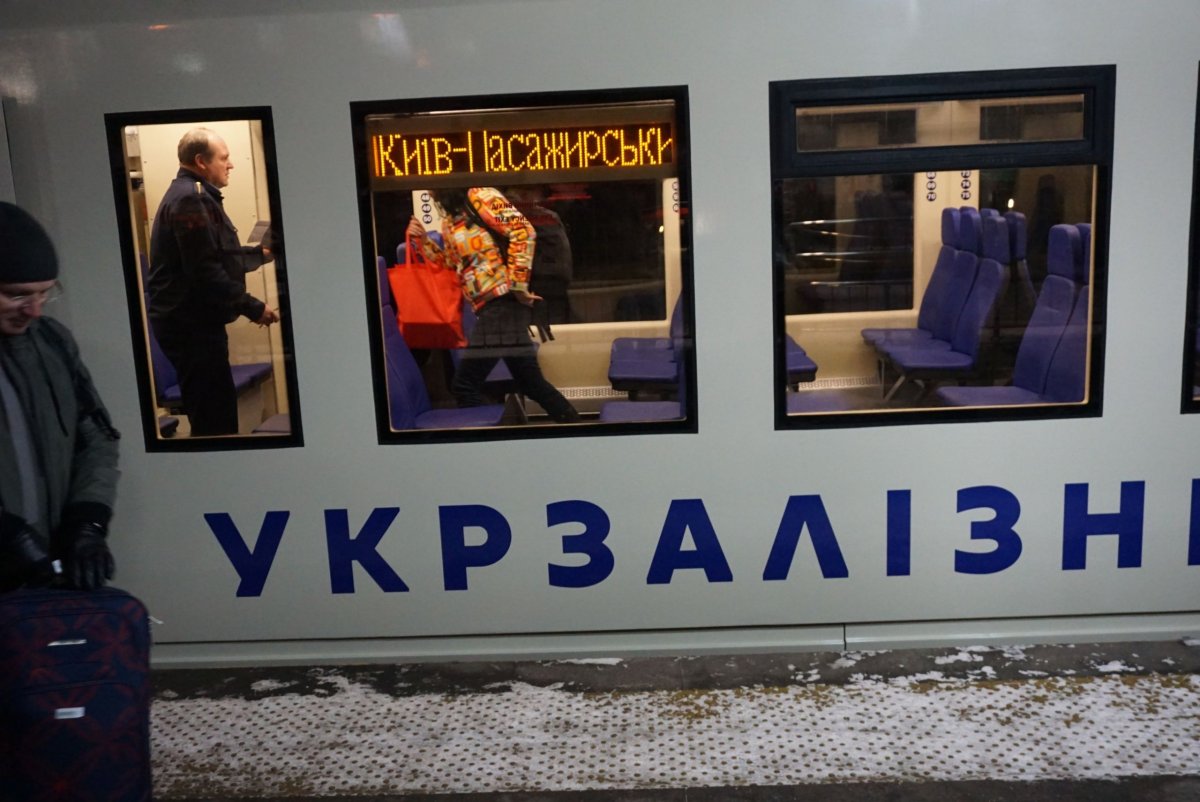Po vstupu do haly si beru imigrační lístky a stavím se do fronty. Jsem jediný - nikdo je nevyplňuje. Fronta je sice dlouhá, ale rychle odsypá. Půvabná vojanda nám dává razítko do pasu a papírek po nás nežádá. V hale hledám bankomat. Místo něj narážím na automat na vlak, jde platit kartou. Venku odbočíme vpravo a hledáme stanici vlaku Borispol express. Značení nic moc, ale jdeme s davem a tak najdeme venkovní přístřešek, kde u pokladny stojí fronta na lístky. My se jdeme rovnou postavit na nástupiště kryté kovovou střechou. Je zima, až praští. Většina lidí stojí na samém začátku. Když přijede vlak, pochopíme proč. Zapomeňte na Heathrow Express, tohle je spíše tramvaj se dvěma vozy. Naštěstí se prodereme dovnitř a najdeme poslední volná místa. Při vcházení jsme museli přeskočit asi 30 cm velkou díru mezi nástupištěm a vlakotramvají. Místo na nohy prakticky žádné. Stará babka za jízdy umývá podlahu, průvodčí kontroluje lístky. Cesta v přetopeném vlaku ale ubíhá svižně a světlená výzdoba některých budov nás uchvacuje.