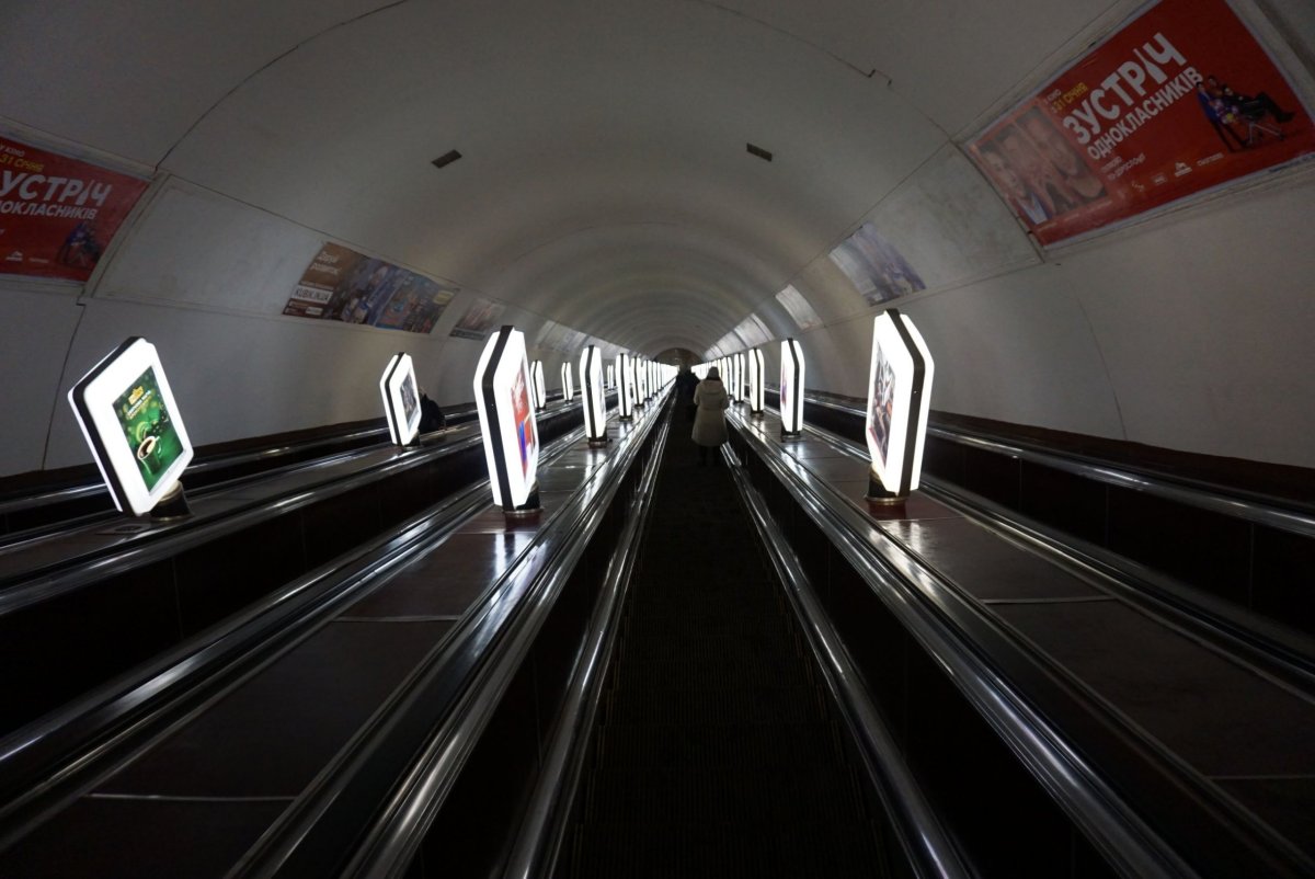 Jdeme ven a ocitneme se na Sibiři. Na zasněžené silnici driftují taxikáři a my přeskakujeme závěje. Stále jsme neviděli jedinou směrovku na metro, ani v azbuce. Dcerka má hlad, zahlédne žluté M a tak skončíme v McDonald. Kdyby to Stalin věděl, asi by se zastřelil. Podle mapy se vydáme hledat metro. V dálce svítí zelené M a pod ním v azbuce Вокзальна. U pokladny kupuji šest žetonů a hned je vrazíme do brány. Pohled dolů z eskalátorů není pro jemné povahy. Kam se hrabe Mírák. V metru se dá naštěstí orientovat lépe. Na sloupu je seznam stanic v azbuce i latince, kam daný směr jede. My máme pokoj u Majdanu, takže bereme směr stanice Khreshchatyk.