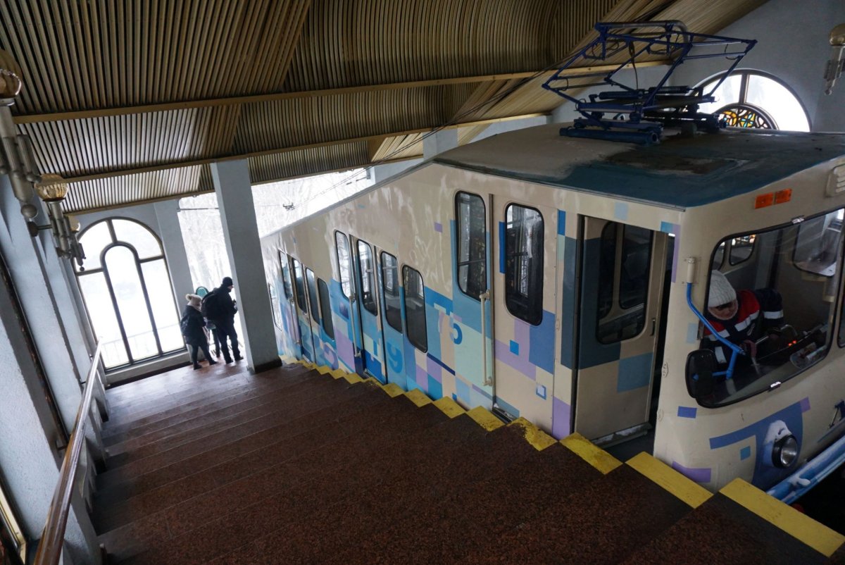 Nasnídáme se přímo na Majdanu kousek od hotelu v malém bistru, kde nám připraví bagetu na přání. Pak jdeme zase do metra. Ocitáme se v spleti uliček se spoustou krámků. Je to labyrint v azbuce. Hledám směrovku metro, marně. Sergeji Ivanoviči, kde udělali soudruzi chybu? Najednou zaslechnu povědomý zvuk. Ťok, ťok, ťok, pauza, ťok, ťok,ťok. Tohle jsem přece slyšel včera večer u metra Vokzalna! Jdeme za zvukem a skutečně, našli jsme poklad, totiž vchod do metra. Sedáme do metra a jedeme na Poštovní náměstí. Jen co vyjdeme ven, uvidím lanovku. Míříme k němu. Opět u kasy fronta turistů. Lanovka tu už stojí. Když se přiblížíme, masa se zrovna dá do pohybu a obsadí celou lanovku. Naštěstí zbylo jedno volné místo v prvním voze, takže si sednu a dcera na klín. Aspoň máme skvělý výhled. Cesta je ale fakt krátká, skoro bych řekl, že za ten žeton nestála.
