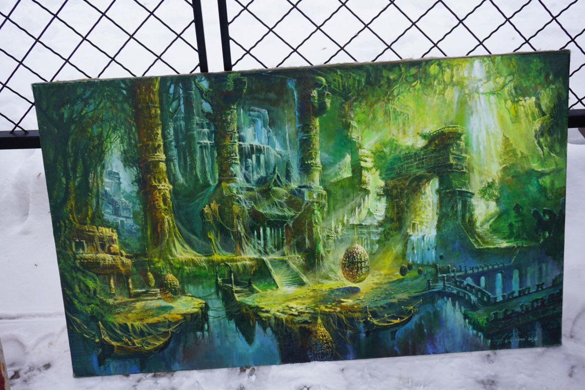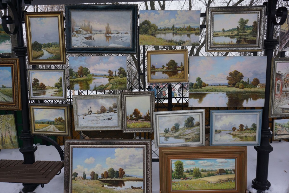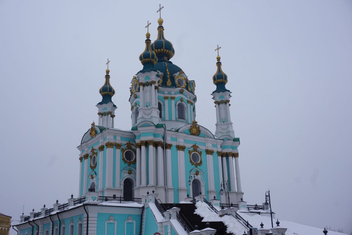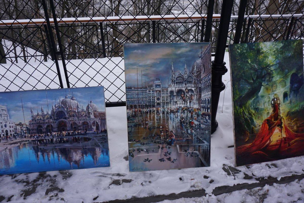 U Svatého Ondřeje mi ostraha říká, že chrám je uzavřen a že venkovní areál nestojí za to. Japonce ale pouští. Udělám aspoň fotku a jdeme dále. U parku vystavují svá díla místní umělci. Jsou fakt hezká. Následuje Andrijivský sestup. Vzhledem k sněhu a ledu spíše sešup. Auta ale nástrahy v pohodě zvládají. Asi jsou na vysokohorské podmínky, pane ministře Ť, zvyklí. Ulička je obklopena stánky. Podle rady z místního průvodce odbočujeme na Pozdvyženskou ulici. Chyba. Je totálně nudná. Dcerku zebou nohy. V dalším obchůdku ji jako bezdomovci vycpávám boty papírovými osuškami. Nepomáhá to. V dalším podchodu v jednom z desítek krámků kupujeme teplé vlněné ponožky. Výlet je zachráněn! Míříme na Kontraktové náměstí.